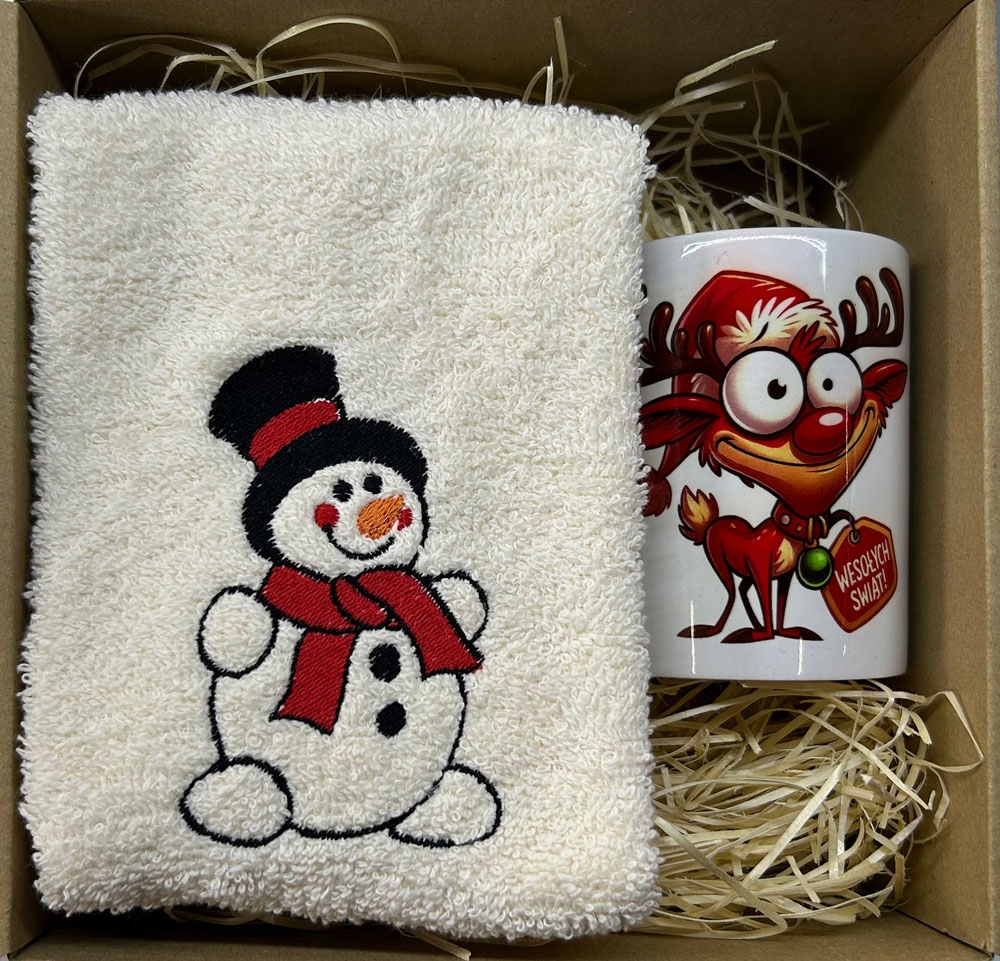 ПОДАРУНКОВА КОРОБА РУШНИК 30Х50 З РІЗДВОВОЮ ВИШИВКОЮ СНІГОВИК КУХЛЯ ОЛЕНЬ