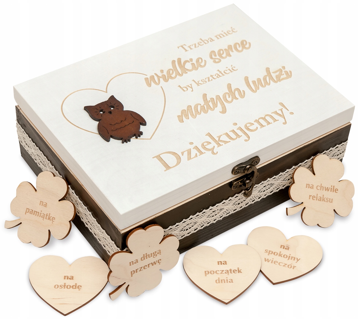 Дерев'яна коробка з відділеннями + присвята вчителю + 3 сердечка і 3 конюшини з гравіюванням.
