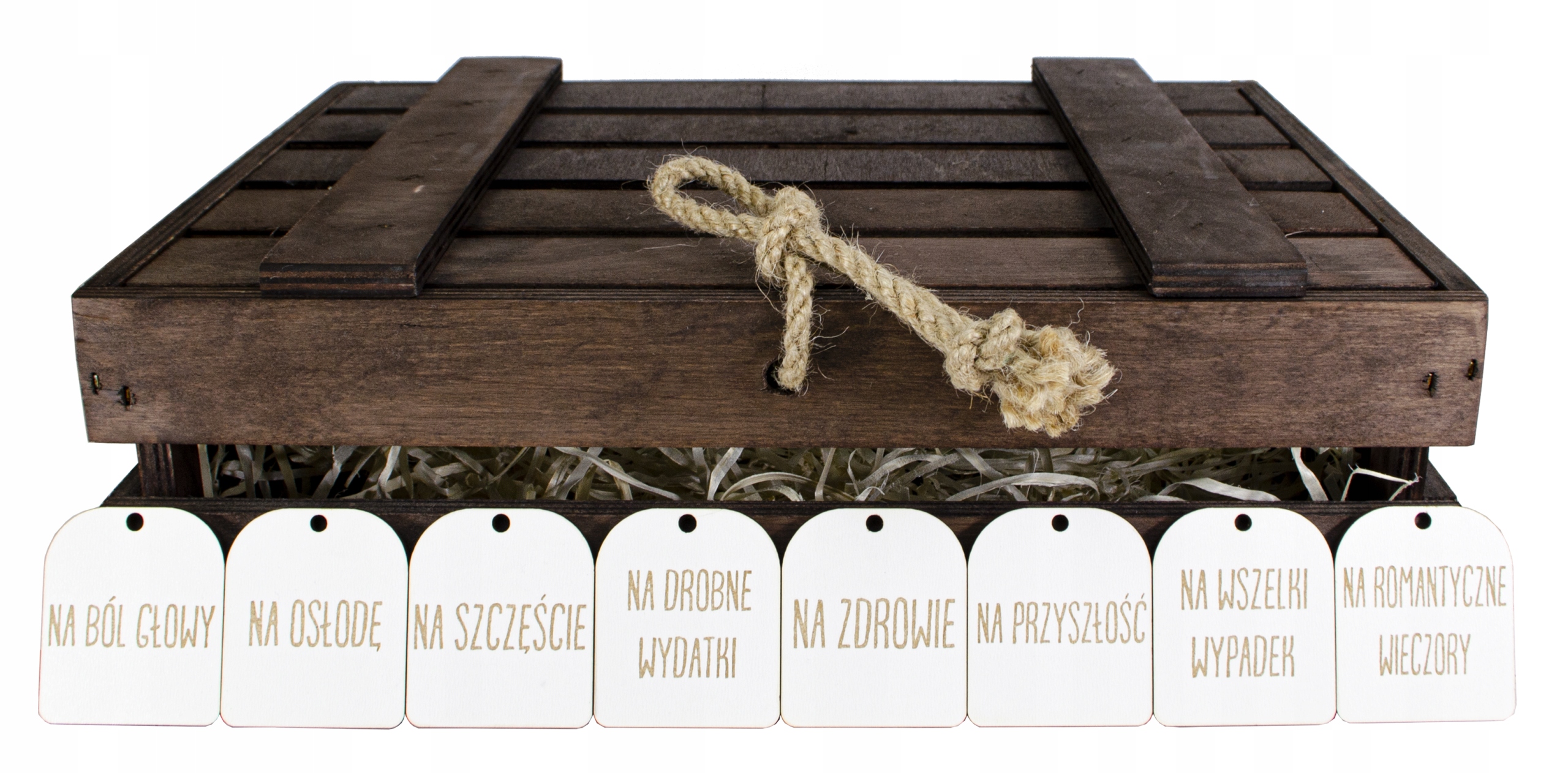 Дерев'яна скринька має джутову нитку, яку можна зав'язати, щоб коробка не відкривалася сама.