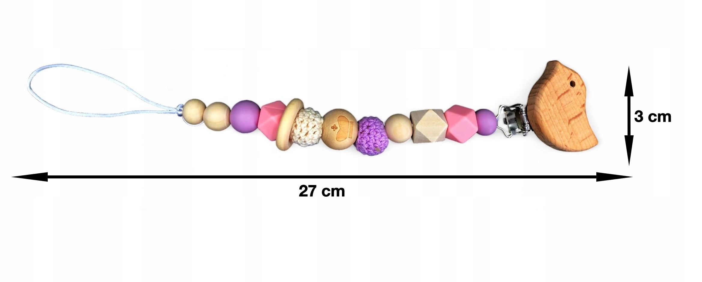 - підвіска/ланцюжок для пустушкиз мотивом птаха, виготовлена з натурального бука, органічної бавовни та силікону в красивих рожево-фіолетових кольорах,