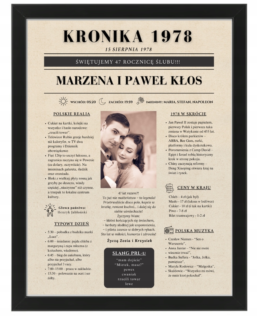 ✨ персоналізований плакат у ретро-атмосфері, у сепії. мелодії, що містять цікаві факти та події року весілля (польська реалія, рік коротко, звичайний день, ціни в країні, глава держави, музичні хіти, побажання, сленг ПНР та багато іншого!