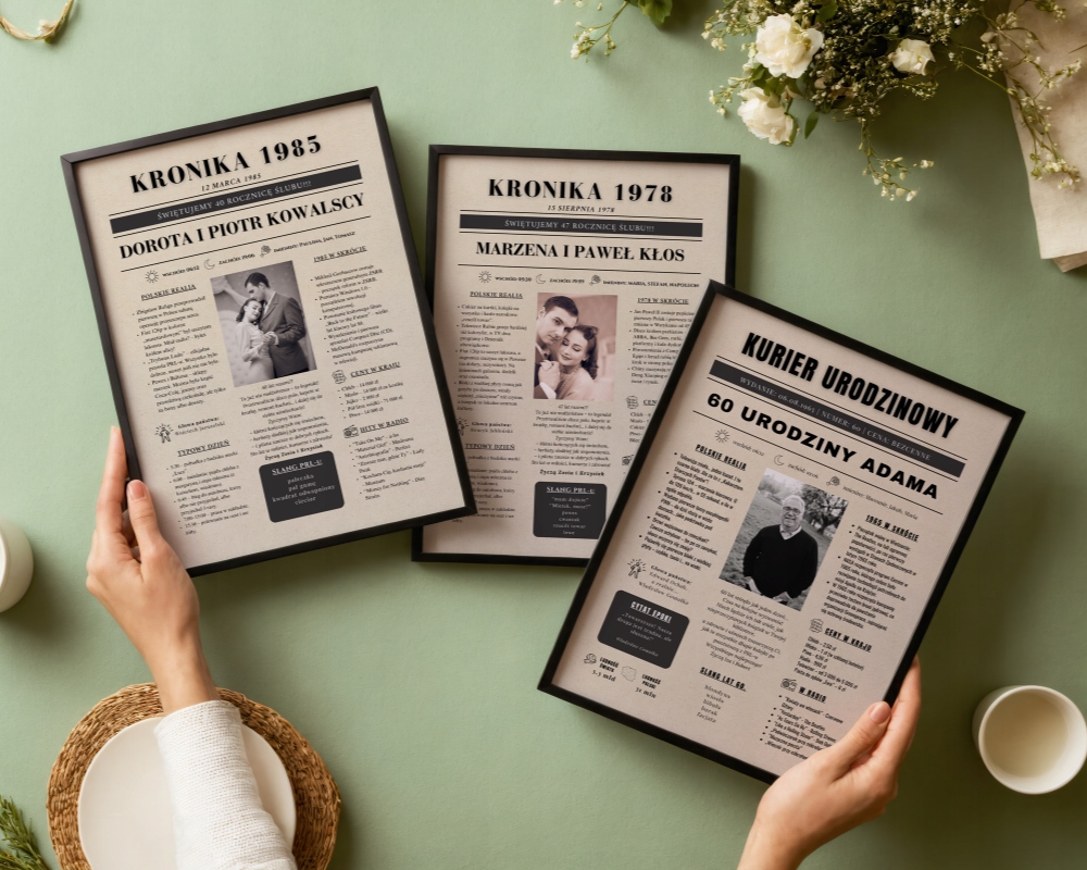 Оберіть персоналізований ювілейний плакат у вигляді стильної газети/інформаційного бюлетеня, обрамленого в елегантну чорну рамку формату А3!