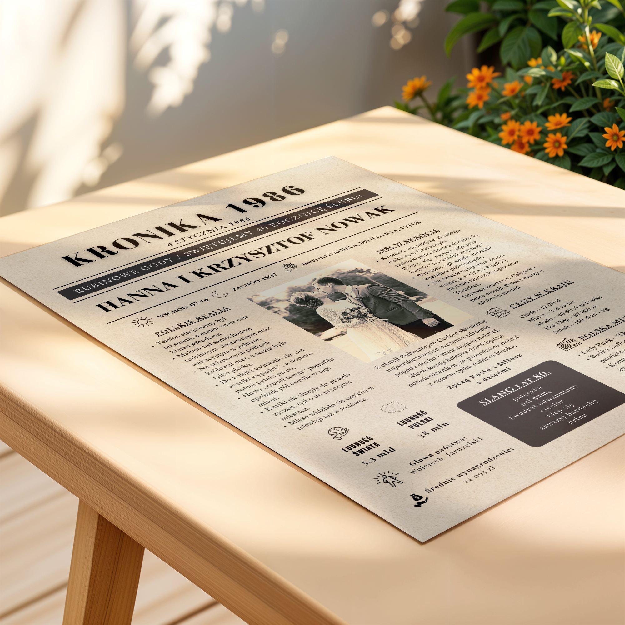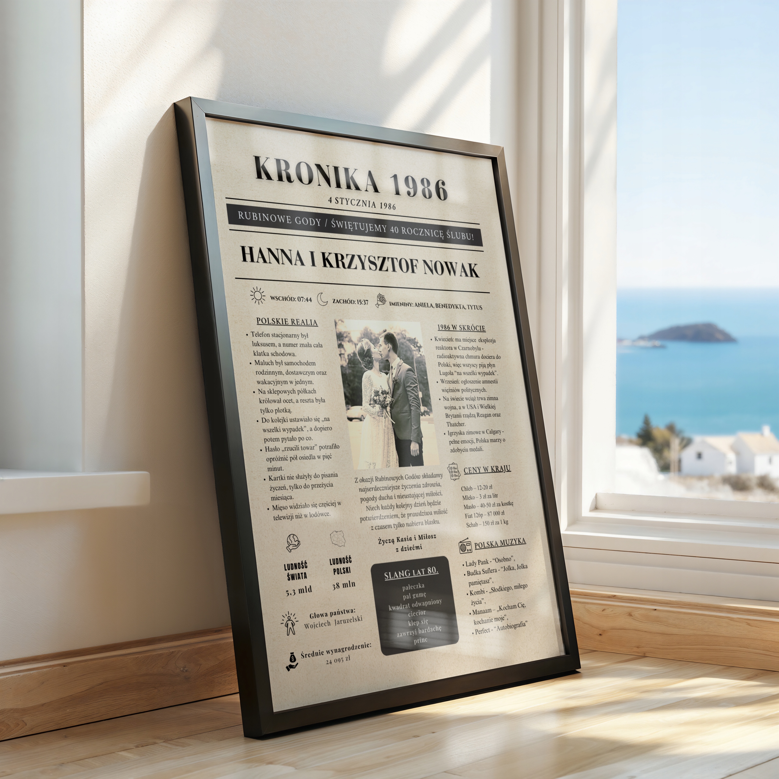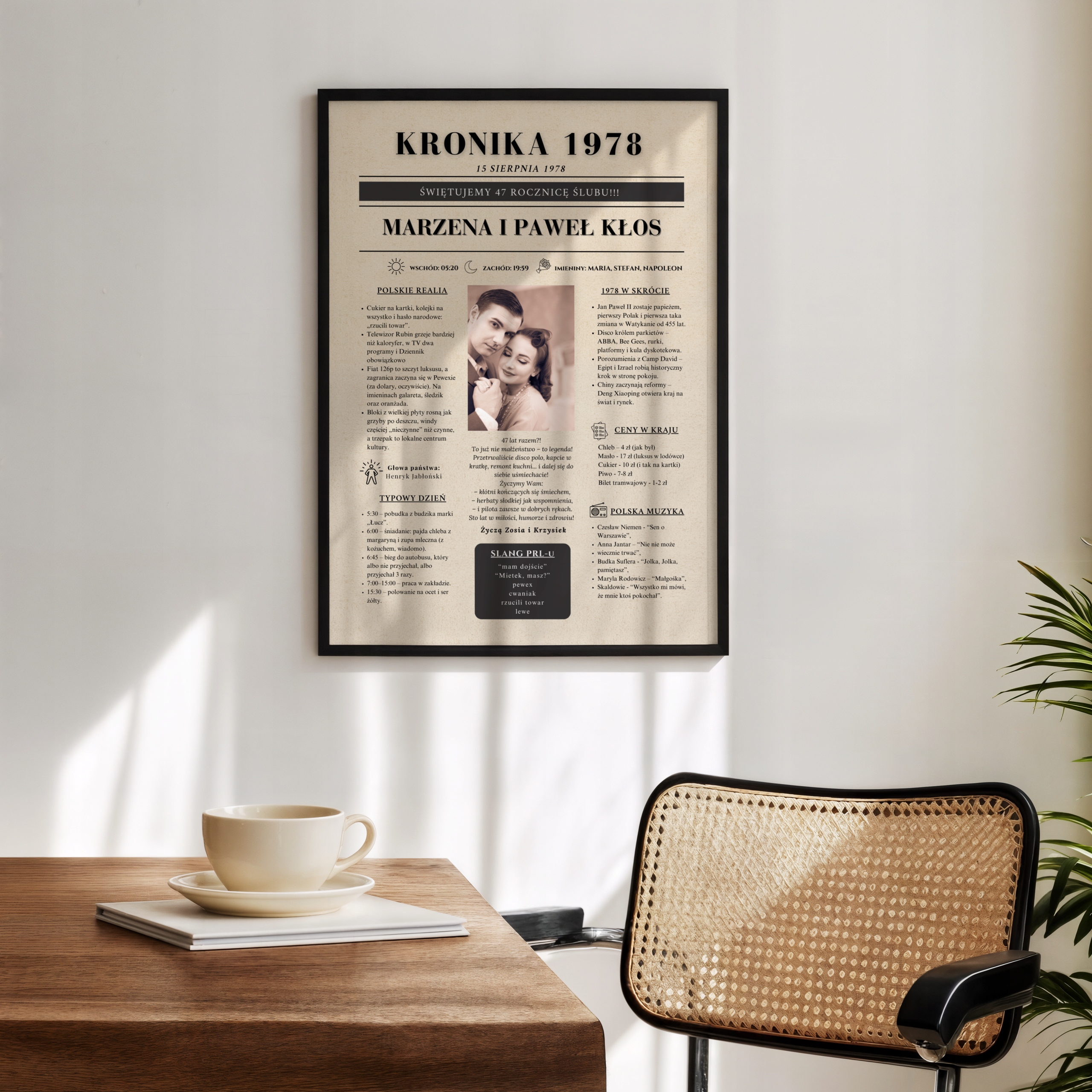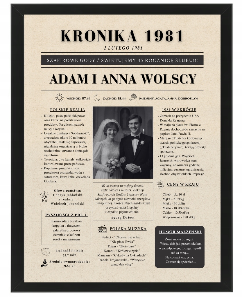 ✨ персоналізований плакат у ретро-атмосфері, у сепії. мелодії, що містять цікаві факти та події з року одруження (польська реалія, рік коротко, звичайний день, ціни в країні, середня зарплата, глава держави, музичні хіти, побажання, сленг ПНР та багато іншого!