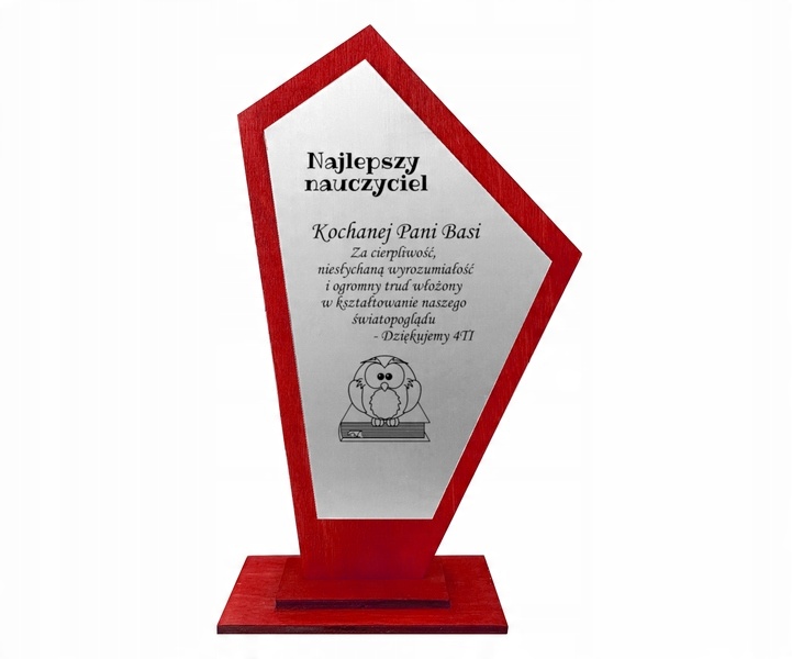 Статуетка виготовлена з дерева (фанера 3мм) кольору "бордо". На статуетку приклеюється пластина з будь-яким ГРАВІЮВАННЯМ. Таблички з гравірувального ламінату, два кольори на вибір: сріблястий та золотистий.