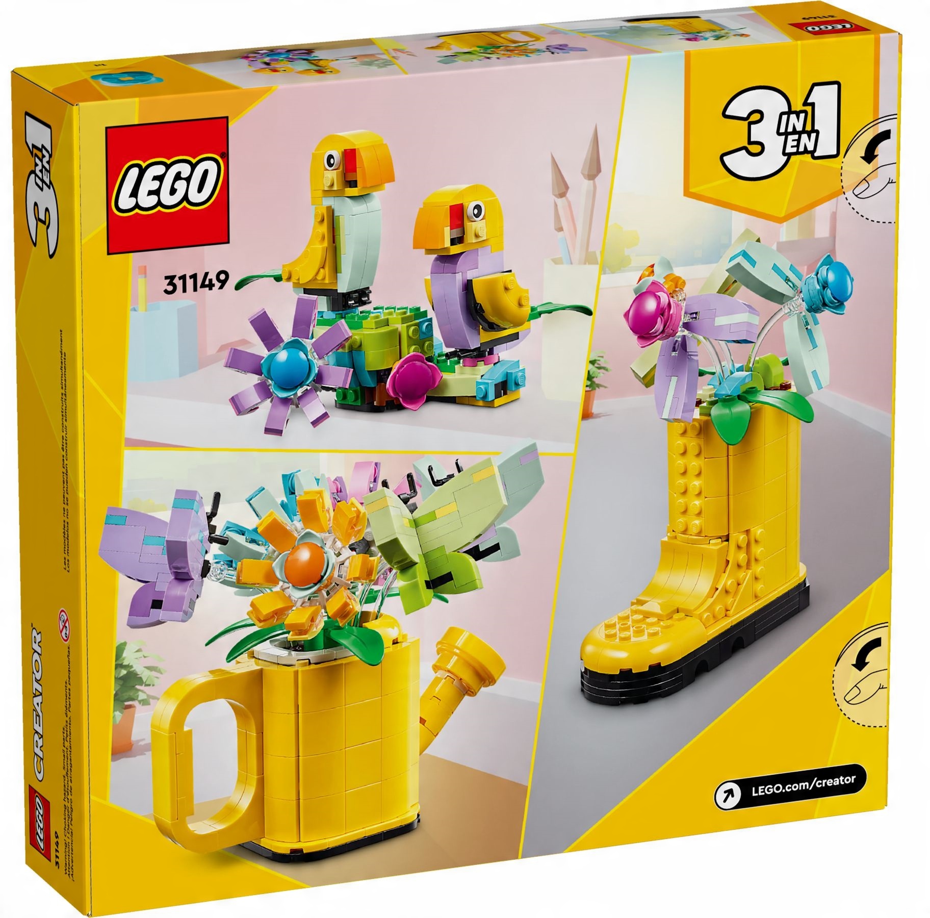 Прикрасьте свою кімнату різнокольоровими квітами в лійці із серії LEGO® Creator. Жовта лійка з ручкою та носиком містить три квітки з рухомими пелюстками та трьох метеликів, які ніби літають! Перебудуйте все і створіть жовтий Веллінгтон із трьома квітами або двома милими пташками на жердинці, вкритій квітами. З цим чудовим набором 3-в-1 вибір за вами.