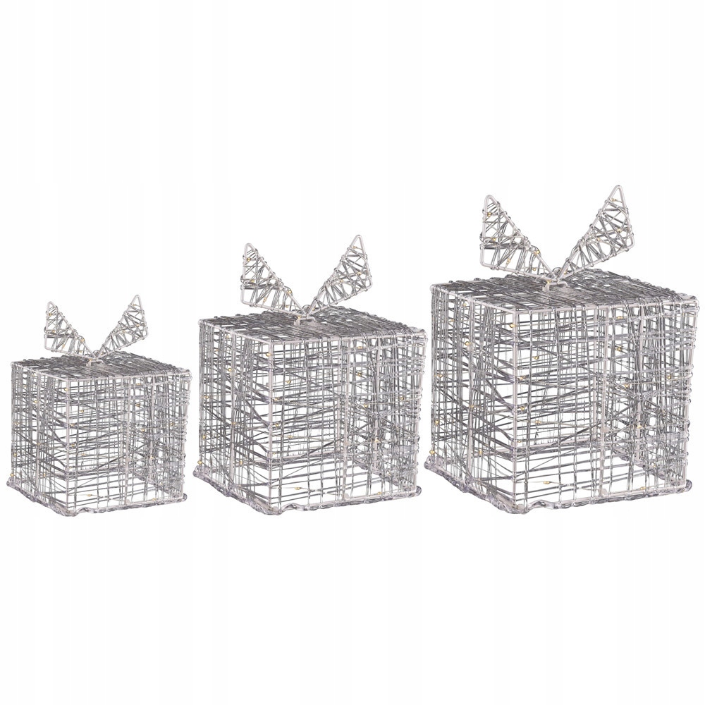 Подарункові коробки зі світловими декораціями 3 розмірів: 1x 12 см, 1x 15 см і 1x 20 см, акрилові, з 90 різнокольоровими мікросвітлодіодами, 5 м прозорого кабелю, відстань між лампочками 10 см, адаптер IP44, джерело живлення: 220-240 В, 50-60 Гц, сек.: 4,5 В постійного струму, 1,35 Вт, 90l, 3v/15MA