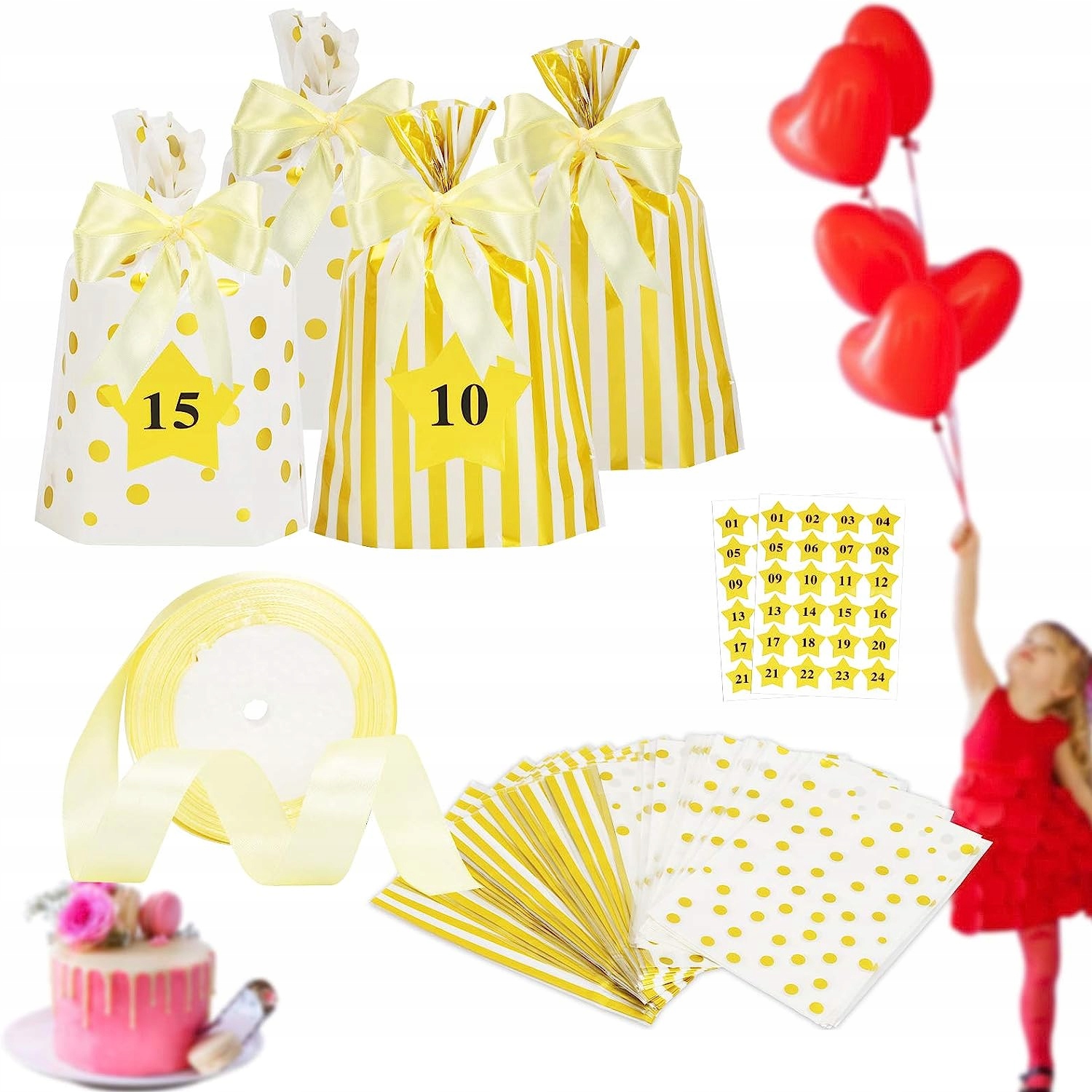 - Загалом 48 красивих різдвяних подарункових пакетів, світло-жовта стрічка 22 м. 24 пакети для подарунків у горошок і 24 пакети для різдвяних подарунків у смужку — ви можете помістити багато дрібні предмети.