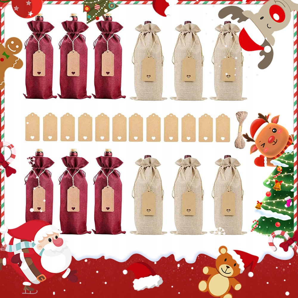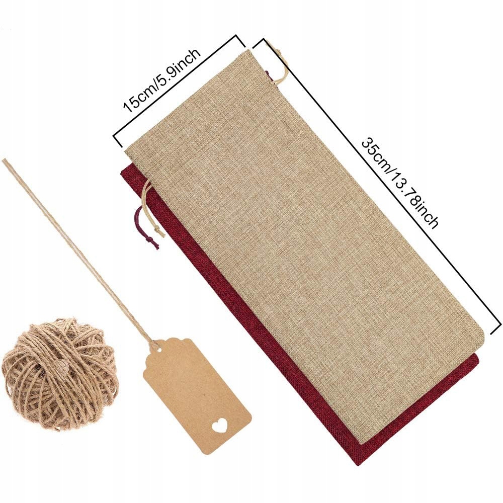 juta Винна сумка має розміри близько 15 x 35 см і вміщує стандартну пляшку вина потужністю 750 мл та більшість пляшок бургунди та шампанського. Винні сумки також можуть вмістити інші предмети. Ідеальні пакети для вина для різдвяних або джутових пакетів для вин для щоденного використання.
