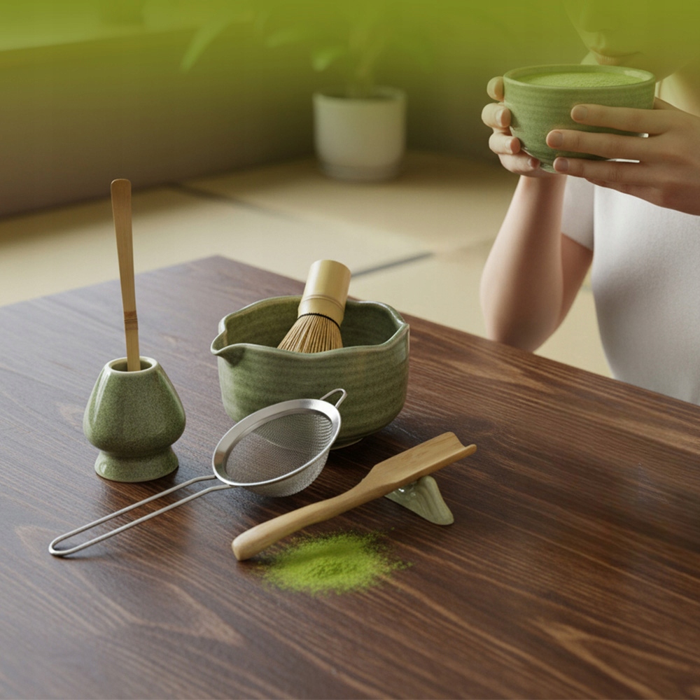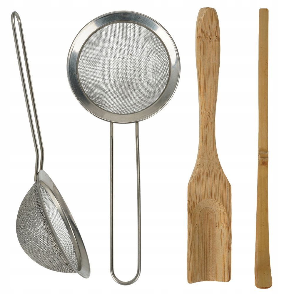 1x керамічна миска для матча з носиком (500 мл), 1x бамбуковий віночок для матча, 1x керамічна підставка для матча, 1x ситечко для матча, 1x тримач для ложок і 2x чайні ложки. Для чудового чаювання.