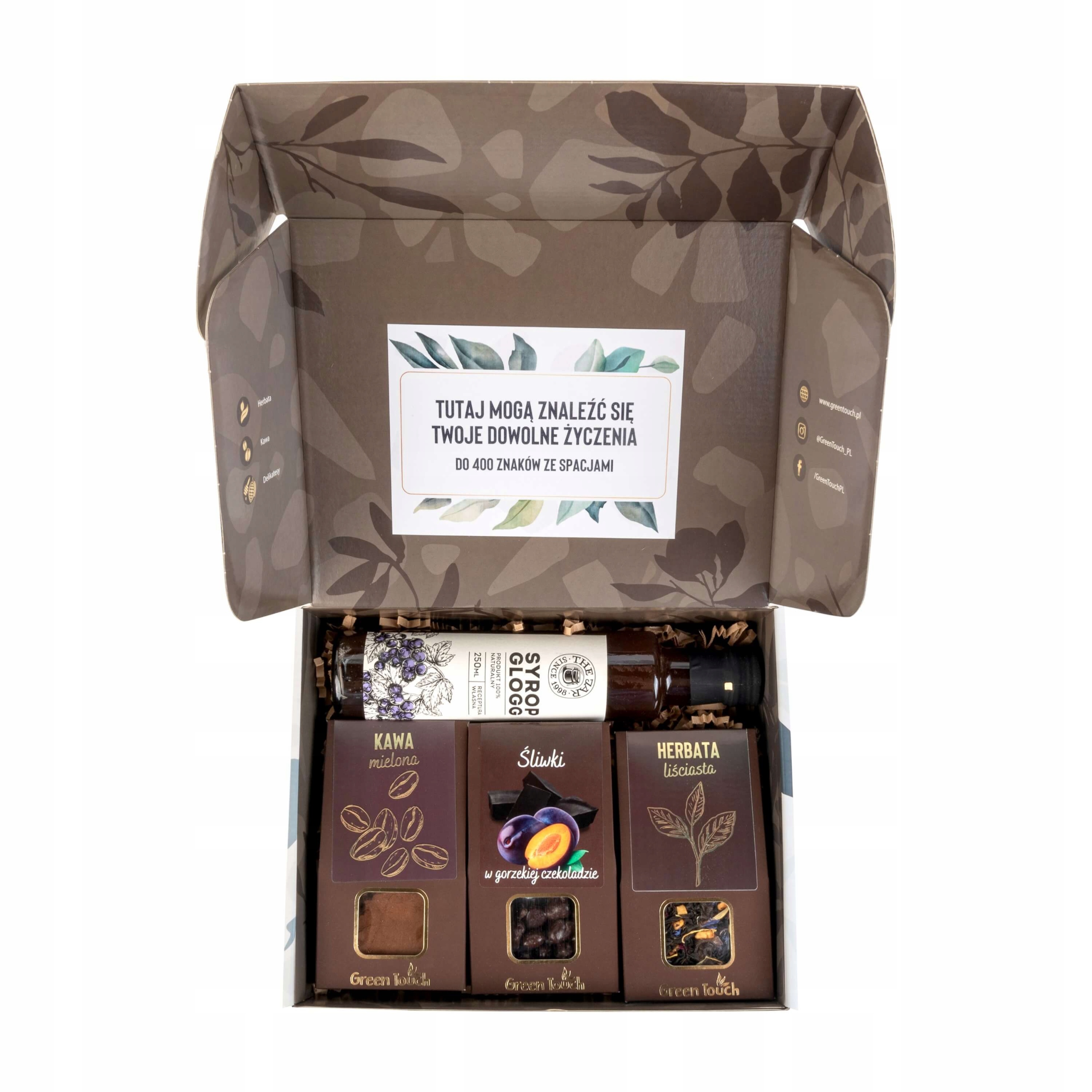 Набір в елегантній коробці, що містить добірний листовий чорний чай Green Touch, ароматну каву 100% арабіка та унікальні сливи в чорному шоколаді. Його доповнює сироп Glogg від The Jar, створюючи ідеальну композицію смаків. Додайте особисту вітальну листівку та здивуйте своїх близьких унікальним подарунком на будь-яке свято!