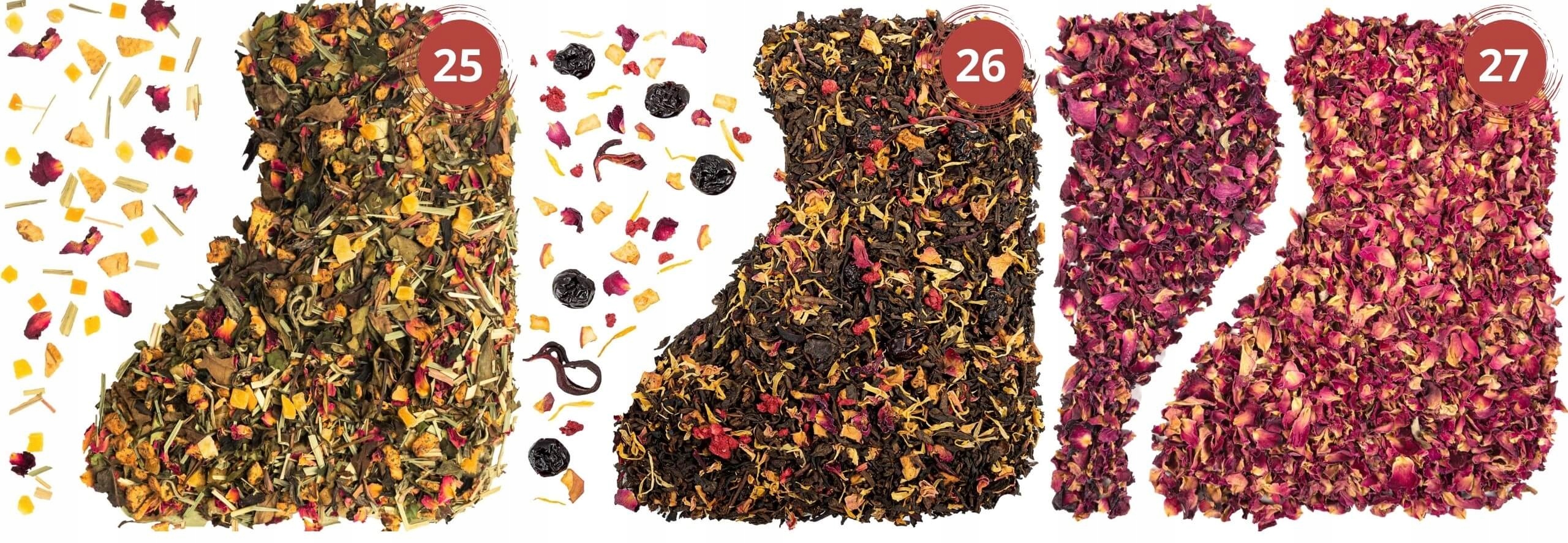 - 26. «Пуер троянда» (35г): червоний чай Пуер, цукати вишні (вишня без кісточок, глюкозно-фруктозний сироп, лимонна кислота, аромат, барвник), гібіскус, яблучне листкове (яблуко 99%, концентрат лимонного соку 1%), заморозка -малина сушена, пелюстки троянд, чорнобривці, аромат.
