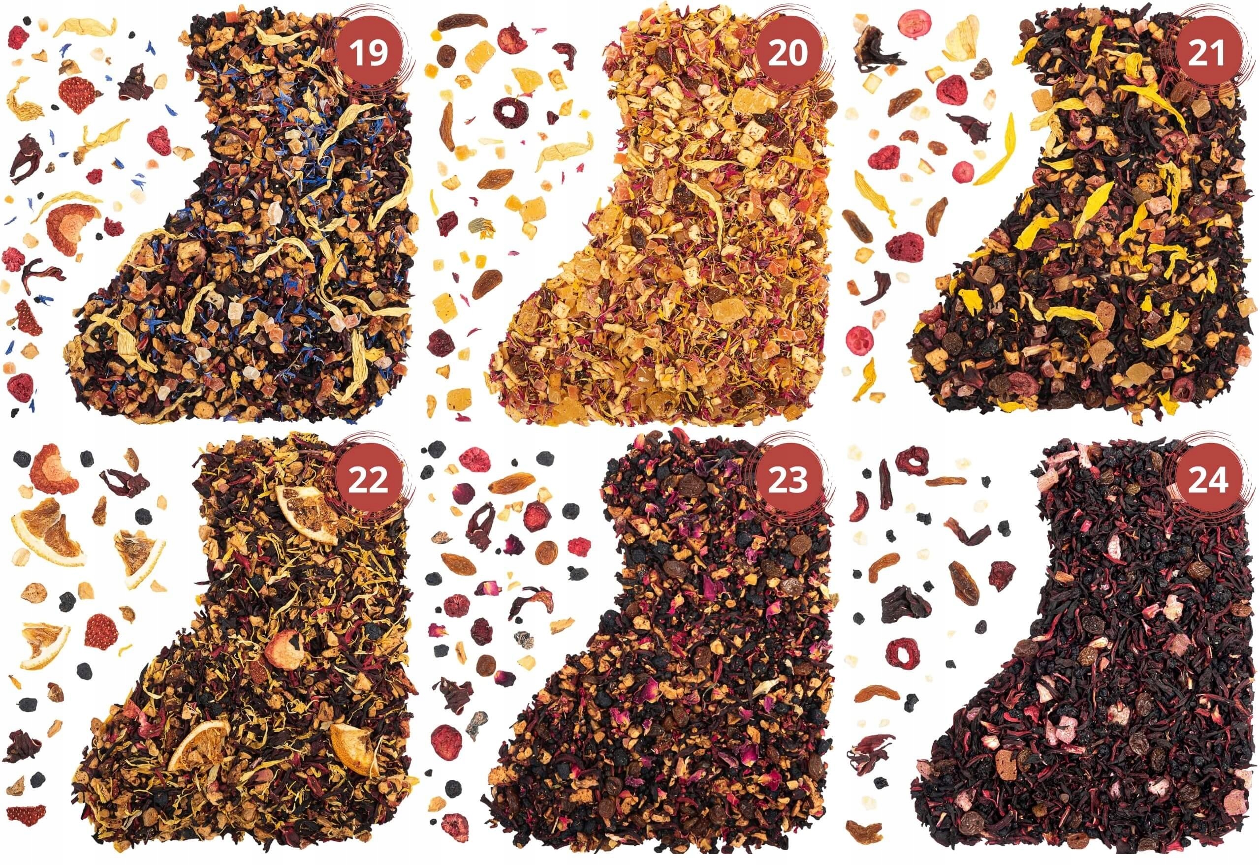 - 13 . «Sunrise»:зелений чай Сенча, родзинки (родзинки, олія), листкове яблуко (99% яблуко, 1% концентрат лимонного соку), ліофілізована полуниця, цедра лимона сушена, жасмин, сандал, волошка, аромат