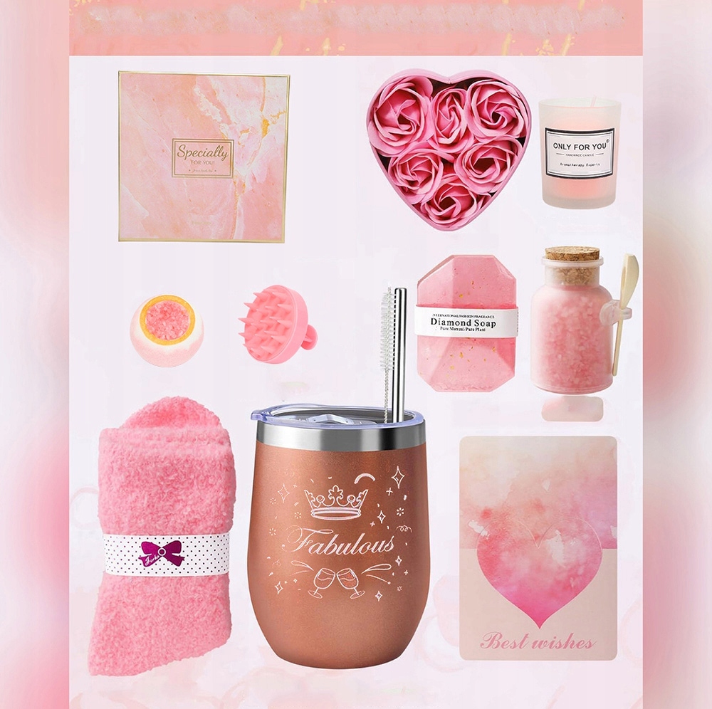 ❤️Подарунковий набір для жінок із 10 предметів❤️: подарунок на день народження для жінок включає 10 добре розроблених предметів: термос на 360 мл (з соломинкою з нержавіючої сталі та щіткою для соломинки) x1, плюшеві шкарпетки x1, шкіра голови Масажна щітка x1, ароматерапевтична свічка x1, сіль для ванн (з ложечкою)) x1, бомбочка для ванни x1, мило ручної роботи x1, мильна квітка x1, вітальна листівка x1 та вишукана подарункова коробка x1.