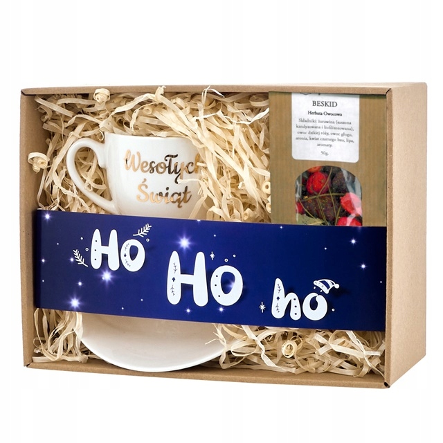 Чашка порцелянова, прикрашена написом "З Різдвом Христовим" золотим. Упаковано в картонну коробку, обшиту деревною ватою та прикрашену затискачем для паперу з різдвяним мотивом. Включено святковий фруктовий чай. Ідеальний набір для різдвяного подарунка.