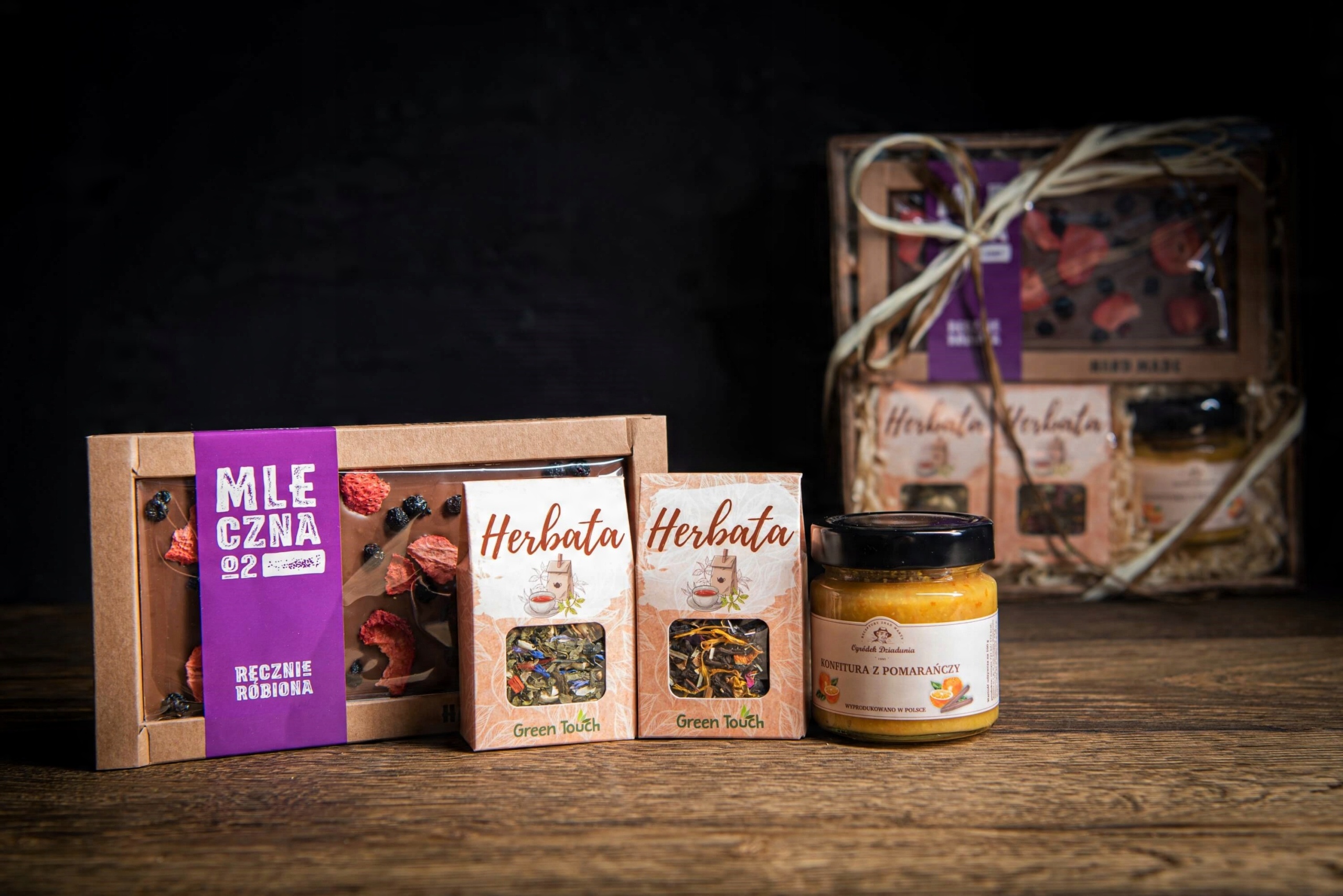 Подарунковий кошик із чаєм, шоколадом і апельсиновим джемом