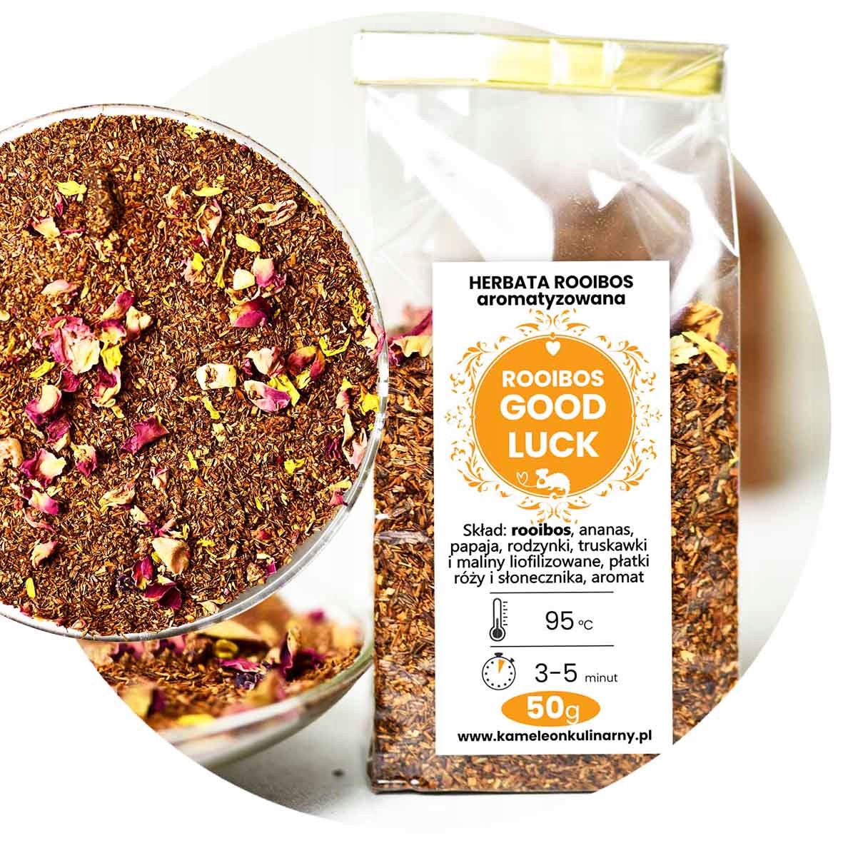 2. ароматизований rooibos удачі (ройбос, ананас, папайя, родзинки, полуниця, малина, троянда, соняшник) 50g3. чай ароматизований rooibos Choco Chili (Rooibos, Apple, Pepper, Cardam, Sunflower) 50G