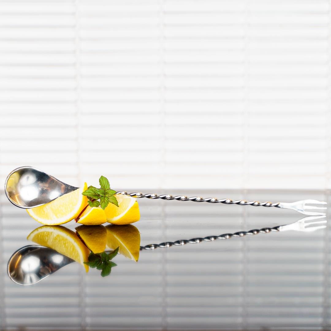 - Ложка для бармена з виделкою - корисна, серед іншого , в напоях, виготовлених у склянці-мішені, для зручного змішування. Це також полегшить приготування багатошарових напоїв. Виделка на кінці ложки дозволяє додавати в напій фрукти, наприклад, скибочки або шматочки лайма чи лимона, гігієнічно та естетично. Це ключова перевага при приготуванні напоїв на очах у гостей.