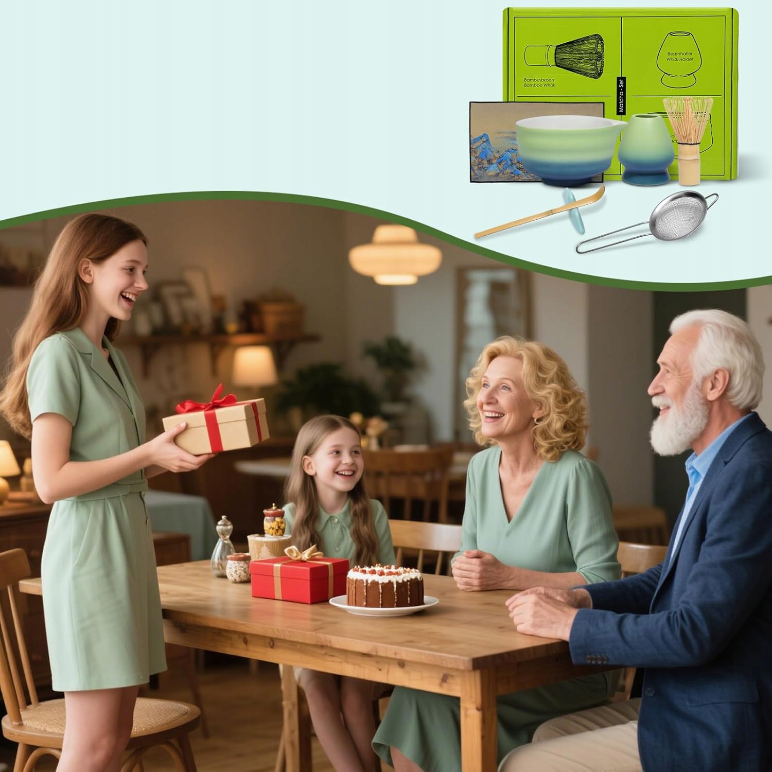 ПОДАРУНКОВИЙ НАБІР ЧАЮ МАТЧА, МИСКА, МІТЛА, ЗЕЛЕНИЙ, 7 ШТ. НА ПОДАРУНОК