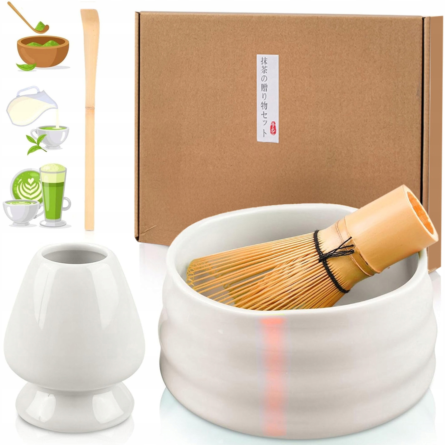 Підставка для миски та віника з високоякісної кераміки, віник та ложка з натурального бамбука. Кожен чайний набір чудово виготовлено вручну, а упаковка ідеально підходить для подарунка.