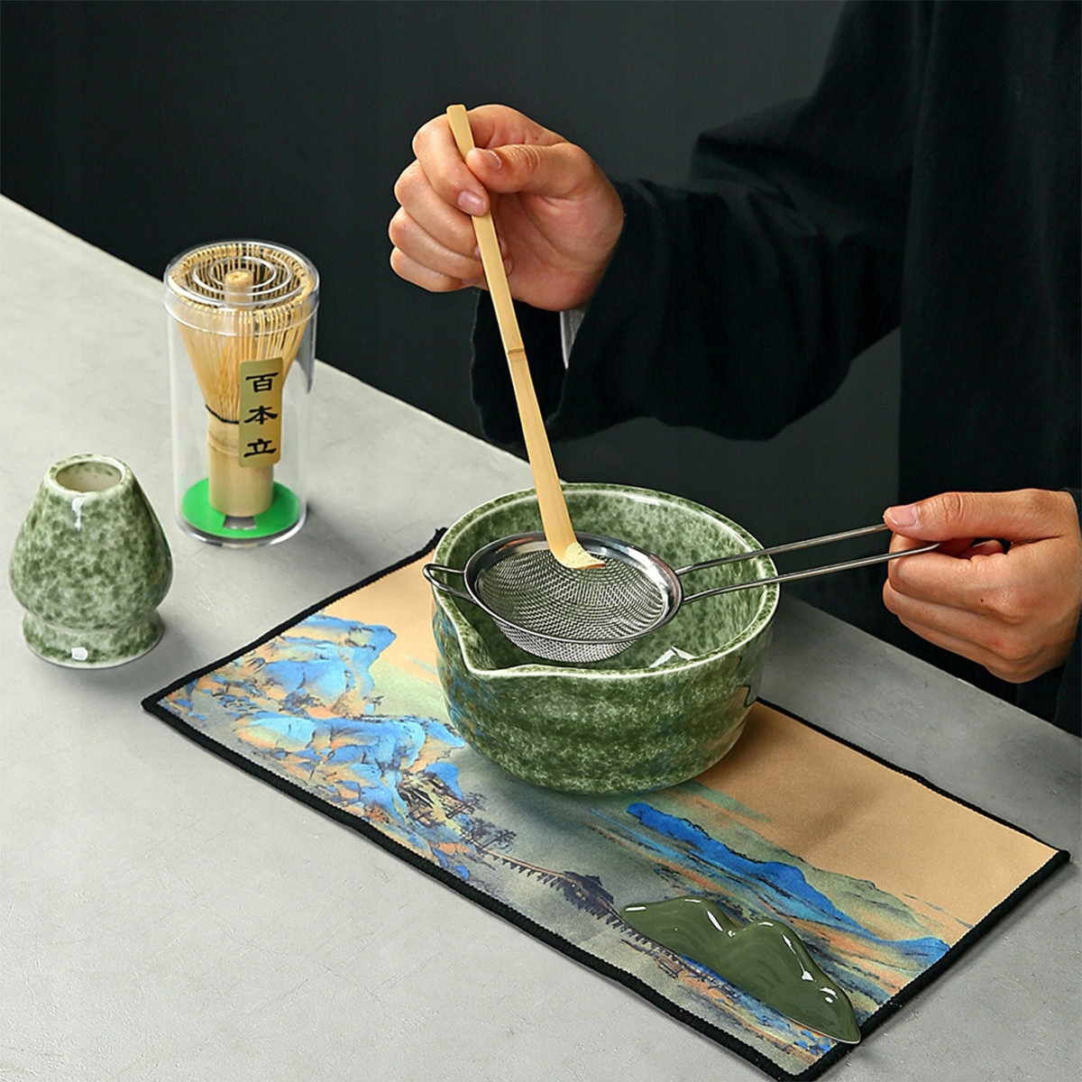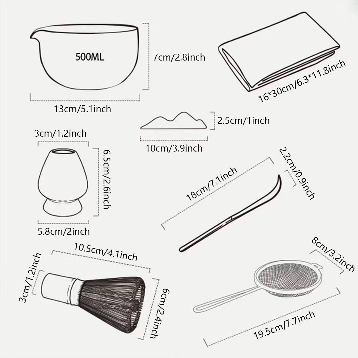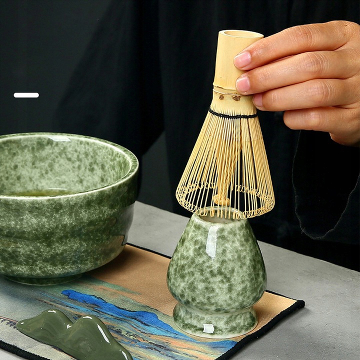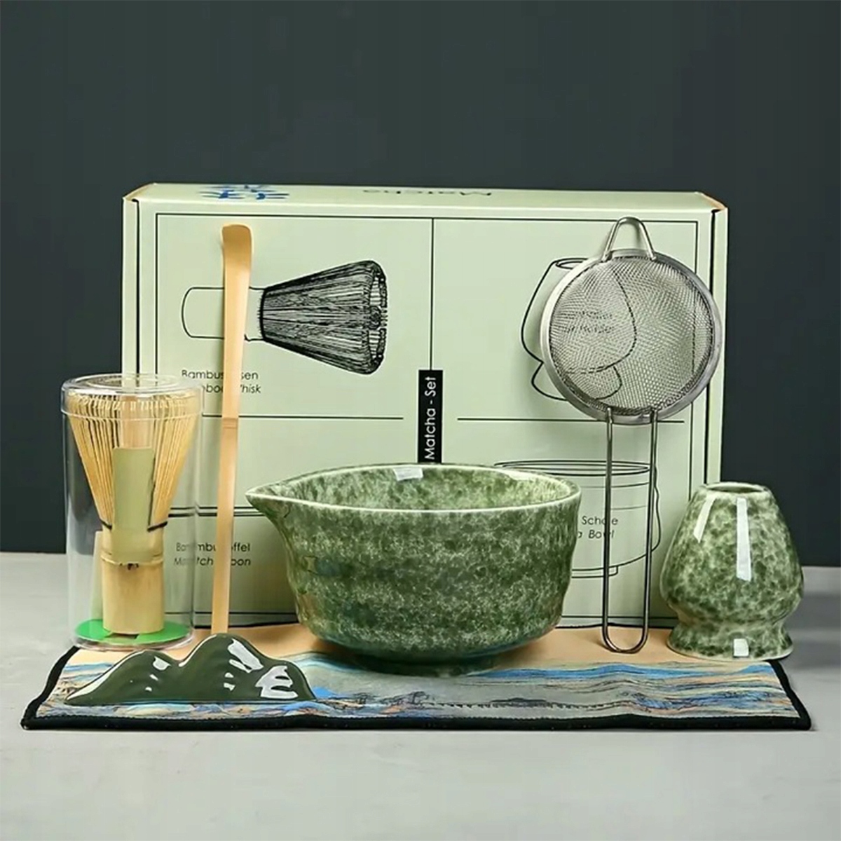 ✔️Набір із 7 предметів включає 1 миску матча, 1 підставку для віночка, 1 віночок для чаю, 1 чайну ложку, 1 решту ложки (малюнок гірської вершини), 1 кухонний рушник і 1 чайне ситечко.