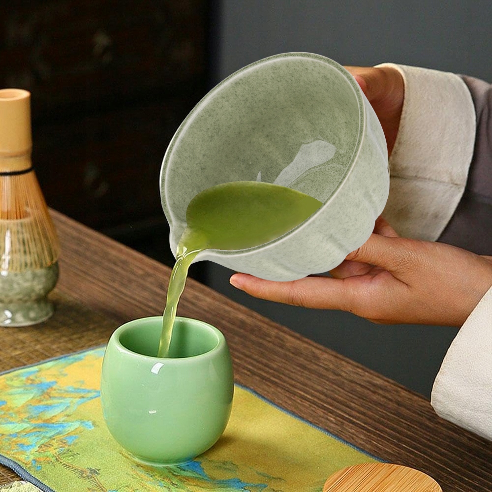 🍵 [призначений для більш високого комфорту]: товста миска з ергономічним луком полегшує точну розливу, тоді як спеціальні анти -слизні лінії заважають їй ковзати. Плямина глазур у тіні зеленого кольору додає витонченість і наближається до традиції церемонії пивоваріння Matchi.