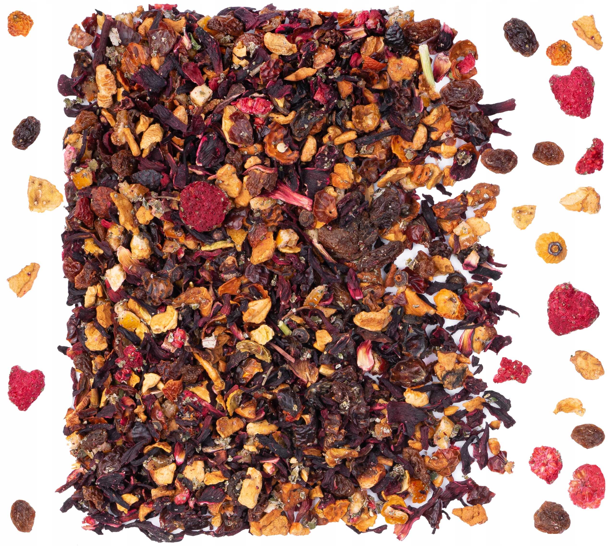 Склад: гібіскус, цедра троянди, яблуко, родзинки (родзинки, олія соняшникова, консервант Е220), апельсиновий карамель. (цедра лимона, цукор, сироп глюкози, регулятор кислотності Е330, консервант Е202, аромат), малина ліофілізована, лист малини, аромат.