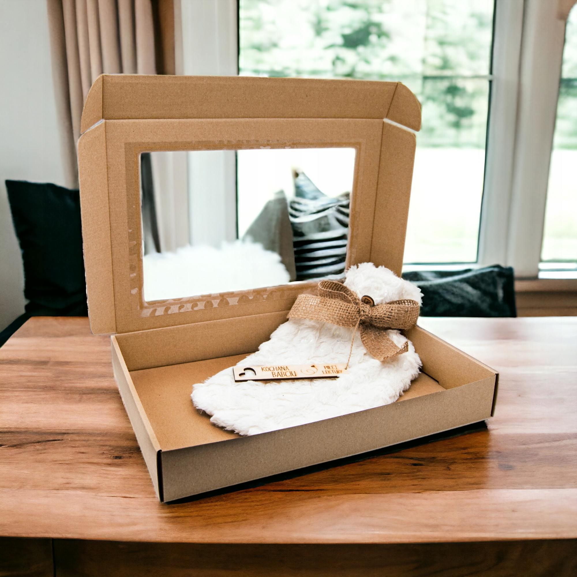 Грілку та закладку упакували в елегантну коробку з віконцем та прикрашену бантом - ідеальна ідея для оригінального та практичного подарунка.