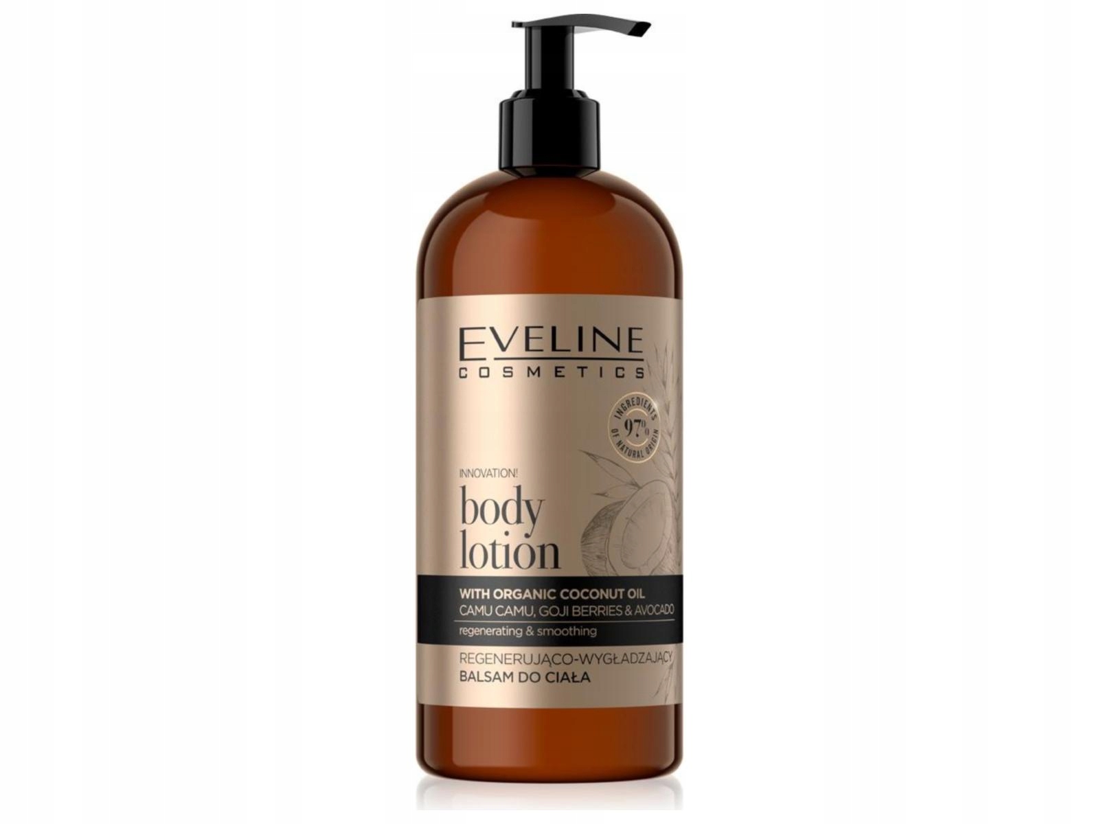 Органічне золото - Лосьйон для тіла від Eveline Cosmetics. Бальзам для тіла. Він створений на основі спеціальної веганської формули з 97% інгредієнтів натурального походження. Забезпечує миттєвий ефект глибокого зволоження та живлення шкіри. Збагачений кокосовою олією, фруктами каму-каму, ягодами годжі та авокадо, він ущільнює гідроліпідний бар'єр, інтенсивно відновлює та очищає шкіру, додає еластичності та напруги. Бальзам можна використовувати для всіх типів шкіри.