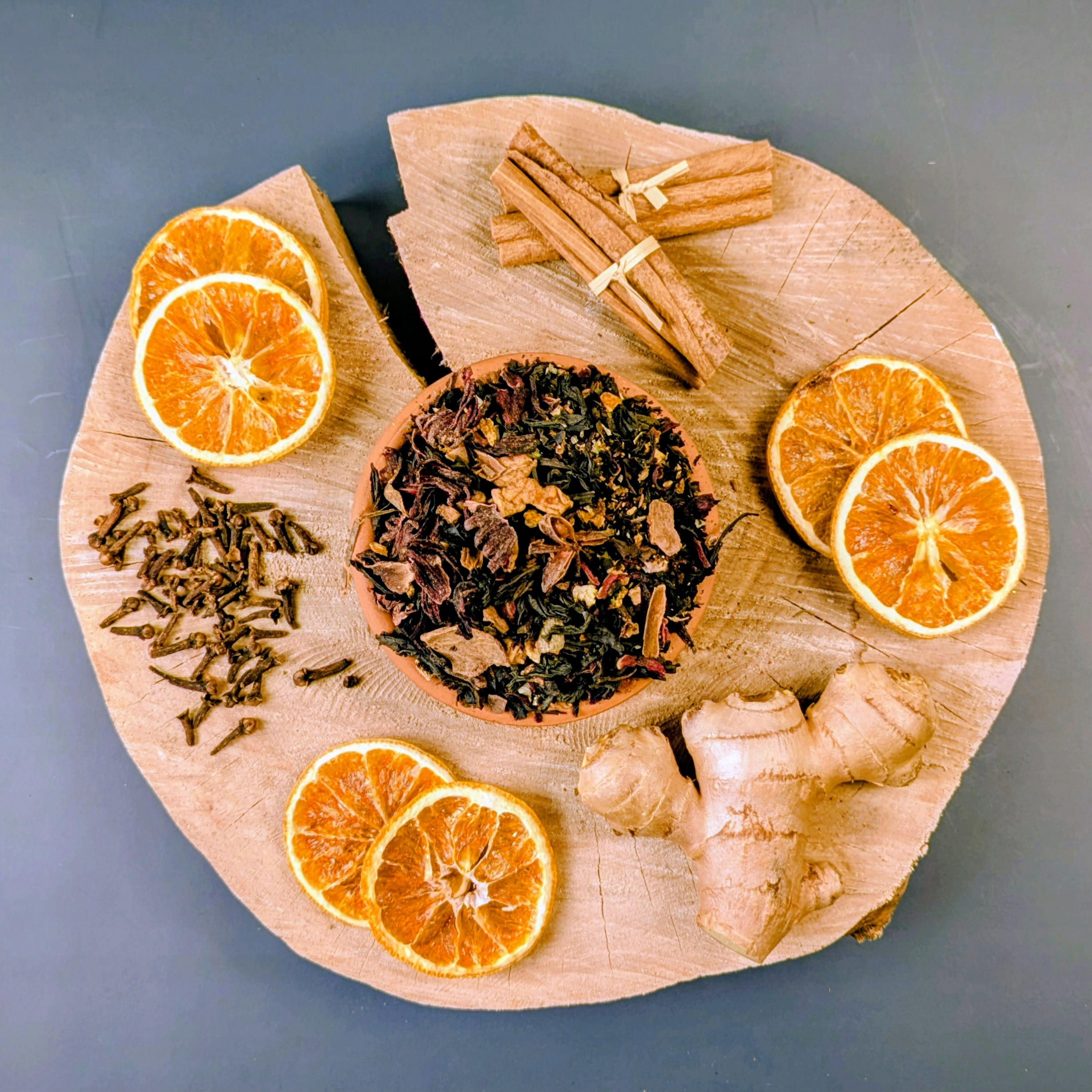 Склад: цейлонський чорний чай 50%, гібіскус, сушене яблуко, цедра апельсина, кора кориці, імбир, аромат, гвоздика, аніс, лист ожини, мускатний горіх.