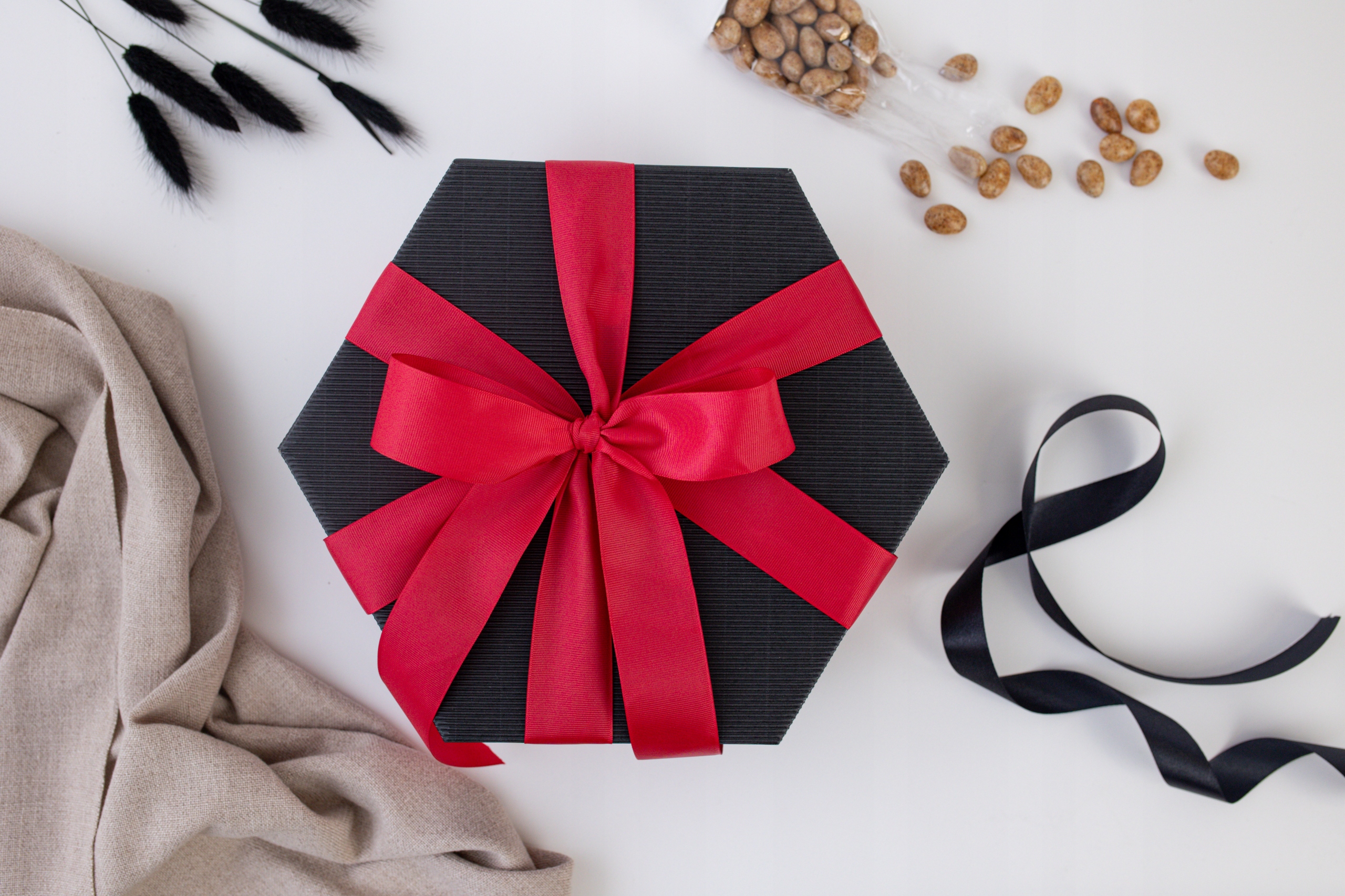 Подарунок, упакований у чорну декоративну коробку та прикрашений стрічкою, - це гарний подарунок, готовий до дарування.