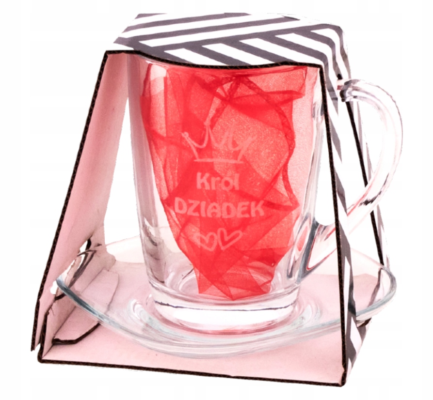 Елегантна скляна чашка з одностороннім гравіюванням «Король-дідусь» і блюдцем в тон. Келих ідеально підходить для повсякденних моментів з улюбленим напоєм. Акуратно упакований в декоративну картонну упаковку, всередині є прикраса з червоної тканини, яка додає елегантності та робить подарунок готовим до вручення.