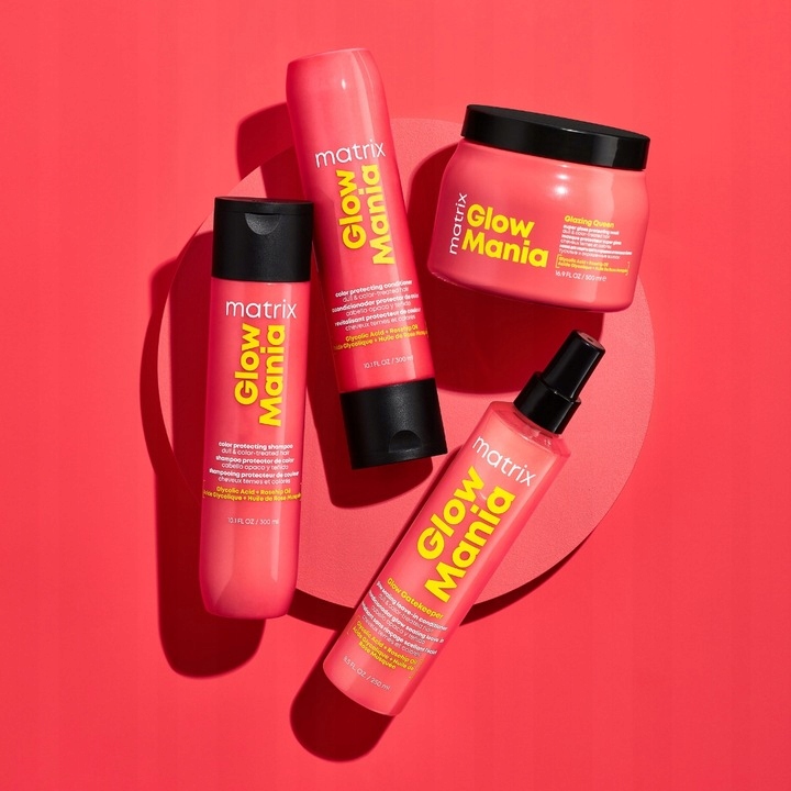 У вас фарбоване або тьмяне волосся? Хочете повернути їм блиск? Хочете, щоб колір тримався довше після фарбування? Шукаєте простий, але ефективний догляд за волоссям? Відкрийте для себе продукти, які відповідають цим потребам. Косметика по догляду за волоссям Matrix Glow Mania! Тепер ви можете придбати ці засоби у вигляді наборів, які миттєво розгладять ваше волосся та захистять його колір до 6 тижнів! Знайомтеся з серією косметики для фарбованого волосся Glow Mania від Matrix, яка підкреслює блиск кольору до 6 тижнів і забезпечує здоровий вигляд волосся. Продукти, збагачені гіалуроновою кислотою та маслом дикої троянди, підходять для всіх типів волосся, від прямого до кучерявого.