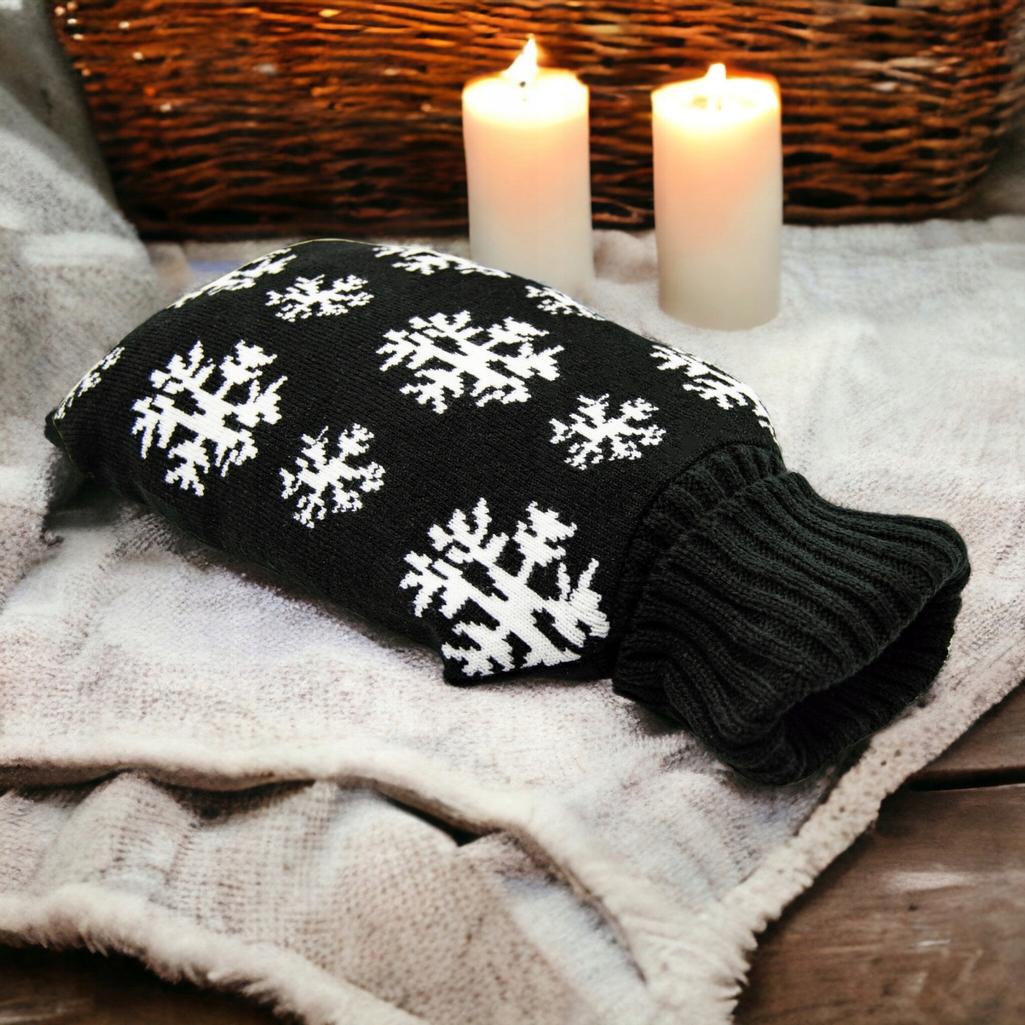 - пляшка з гарячою водою в чорному чохлі з візерунком сніжинки.