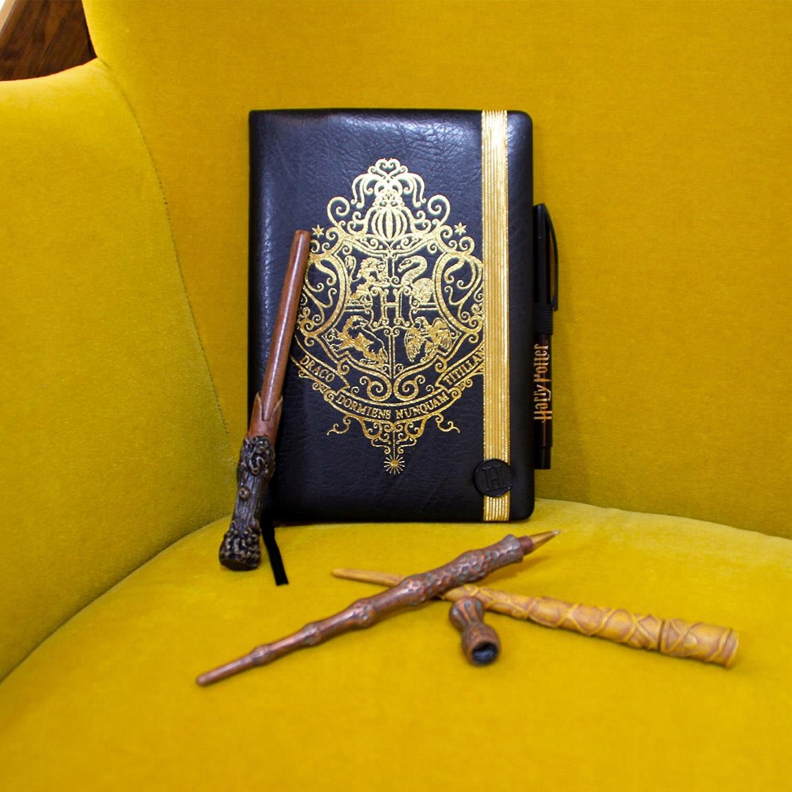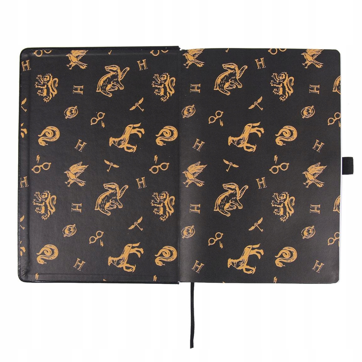 Розкішний зошит у твердій обкладинці, обтягнутий штучною шкірою та прикрашений золотим гербом Хогвартса . b> Блокнот має вшиту стрічку, яка виконує функцію закладки, петельку для ручки та закривається на гумку золотого кольору. Ідеально доповнює все ручка із золотим логотипом Гаррі Поттера.