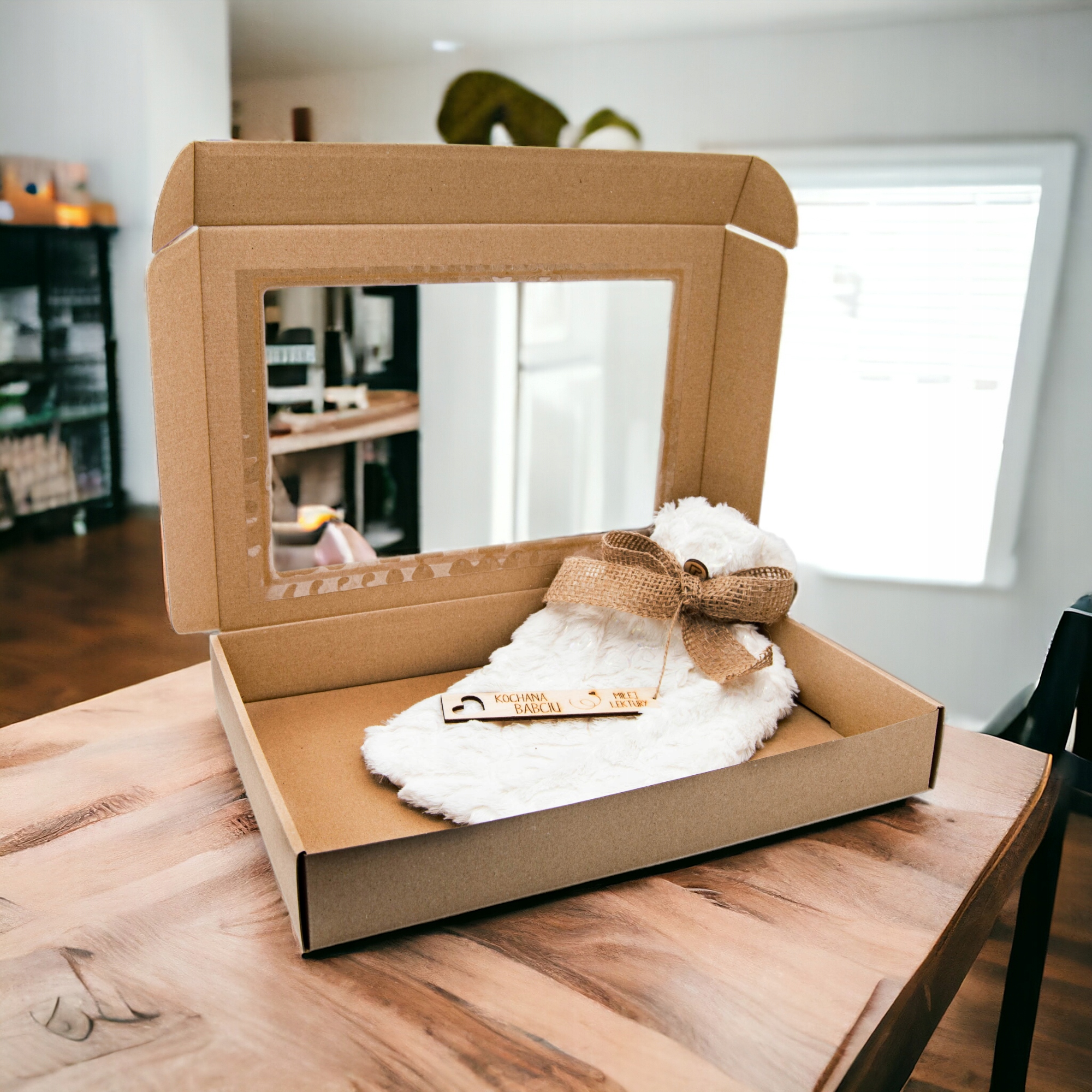 Пляшка гарячої води та закладки були упаковані в елегантну коробку з вікном та прикрашені луком - ідеальна ідея для оригінального та практичного подарунка.