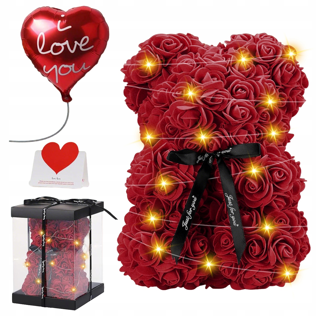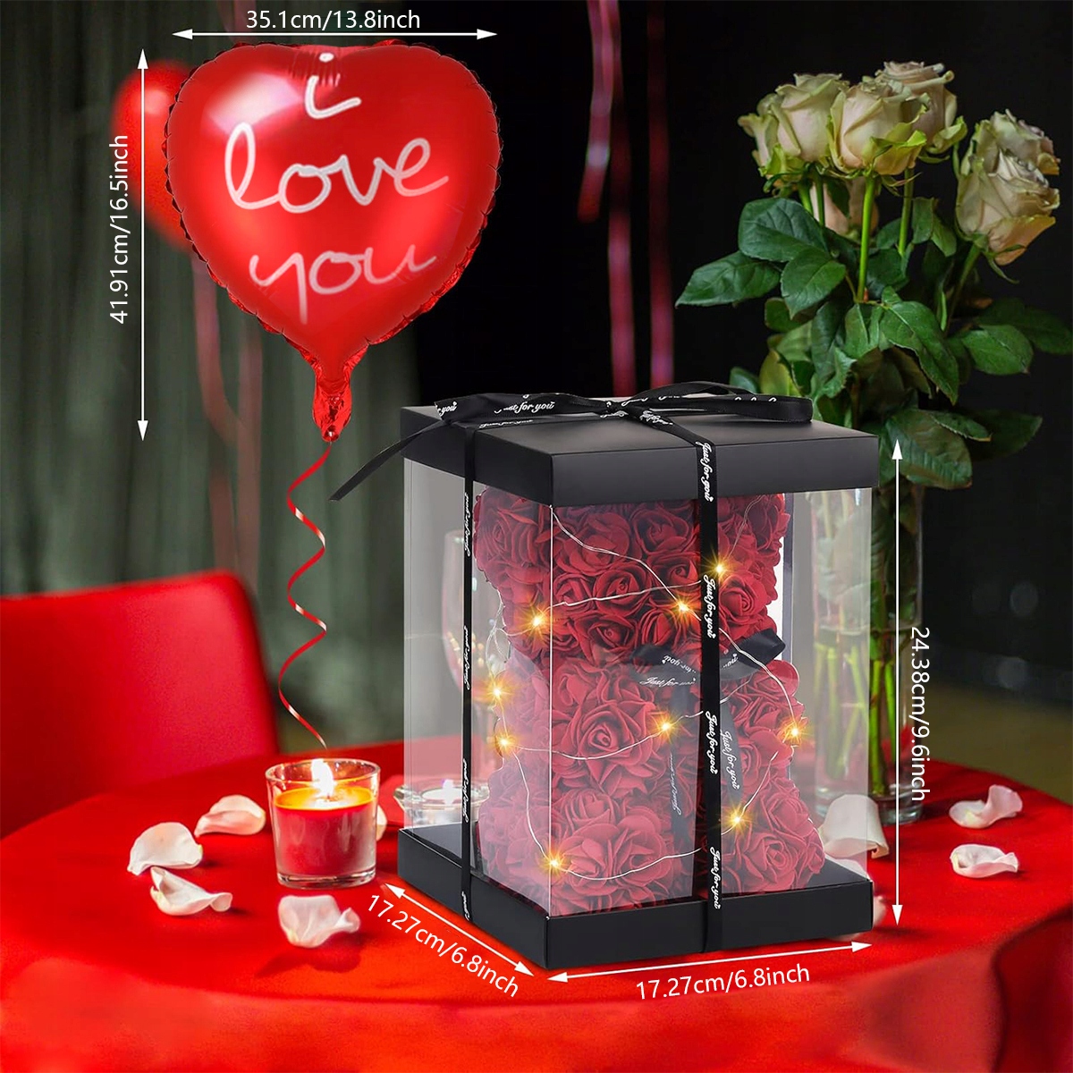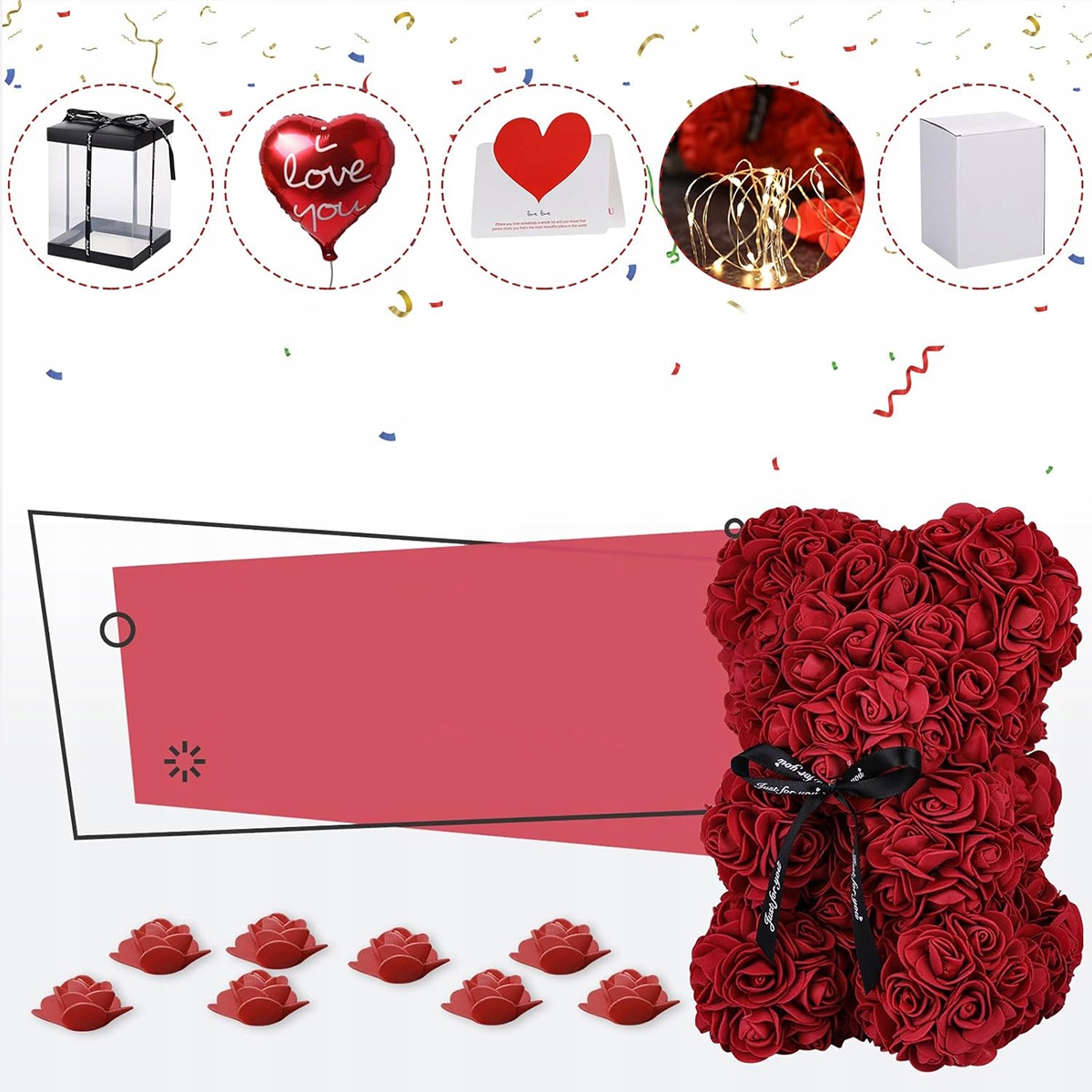 Розмір ведмедика з трояндами приблизно 25 см. Ведмідь зі штучними шовковими трояндами - Оскільки пелюстки троянд «цвітуть» вічно, ви можете поставити їх на полицю чи стіл, і вони завжди будуть милим спогадом про кохання. Додамо червону повітряну кульку та світлодіодну лампу в якості прикраси подарунка, ми віримо, що все разом виправдає ваші очікування.