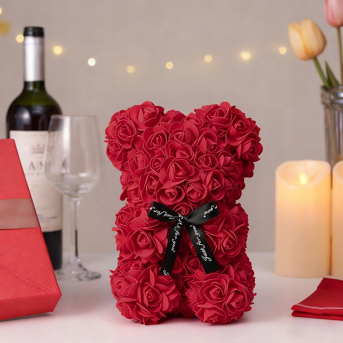 Як новий представник світу плюшевих ведмедиків, рожевий квітковий ведмедик відрізняється від інших плюшевих ведмедиків тим, що він виготовлений зі штучних квітів, схожих на пелюстки троянд. Оскільки рожевий ведмедик зроблений вручну, після тривалого транспортування одна або дві квітки можуть відклеїтися від клею і впасти. Якщо це станеться, ви можете використати клей і приклеїти їх назад.