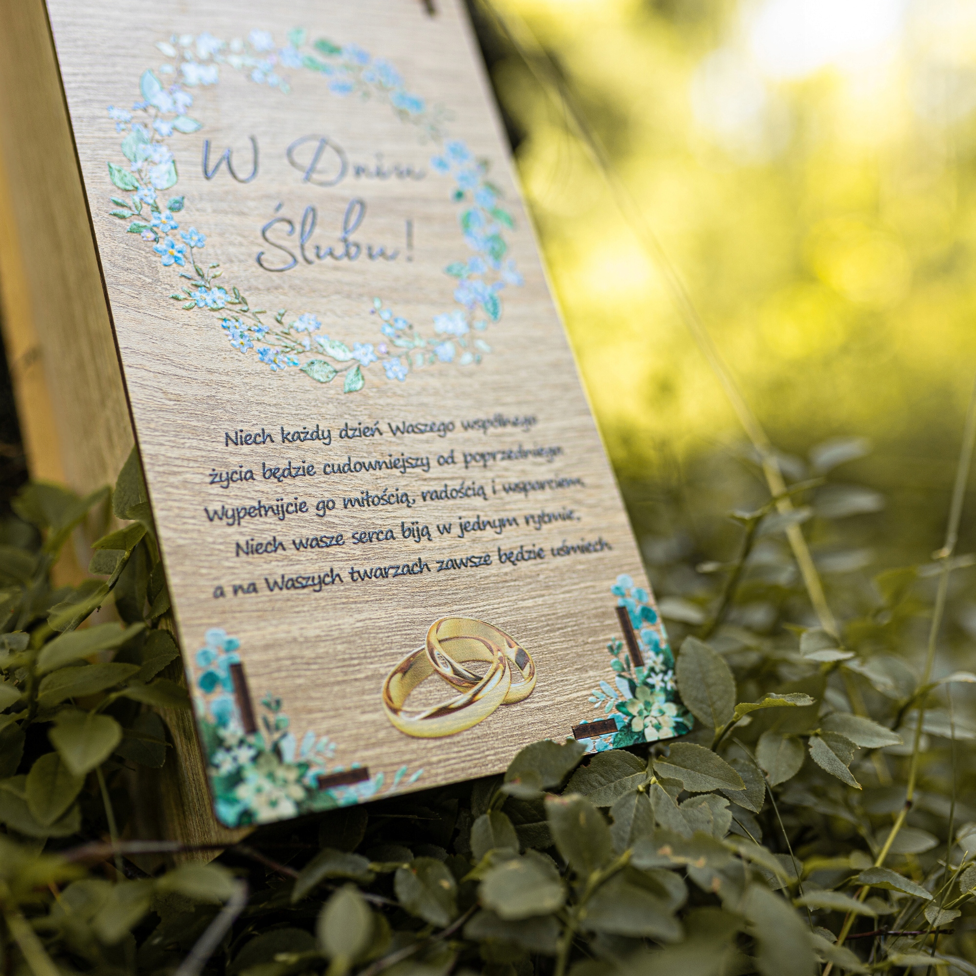На скриньці надруковані унікальні побажання, квітковий вінок і обручки. Завдяки сучасній технології УФ-друку кольори виходять неймовірно насиченими, а вся коробка виглядає дуже урочисто.