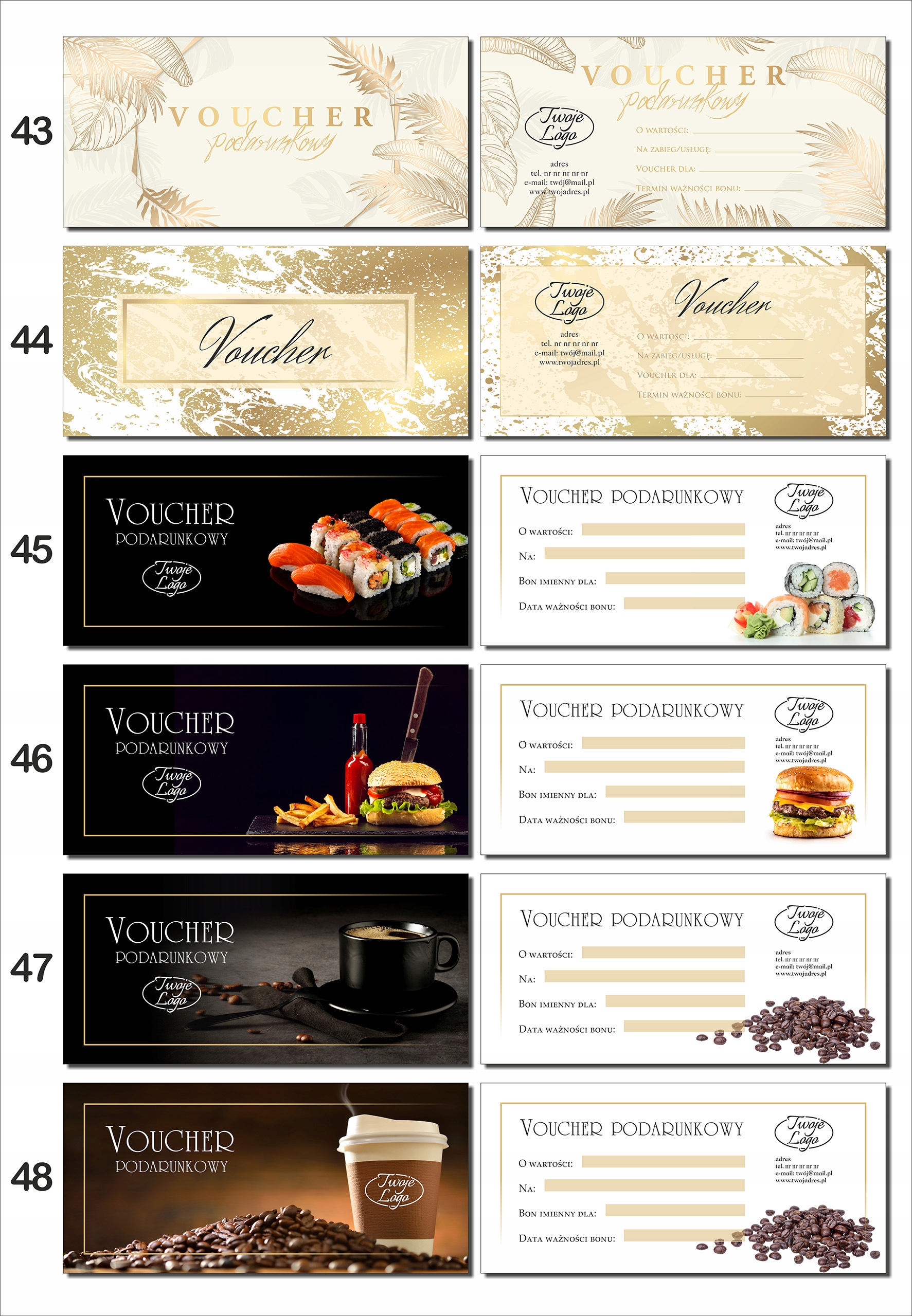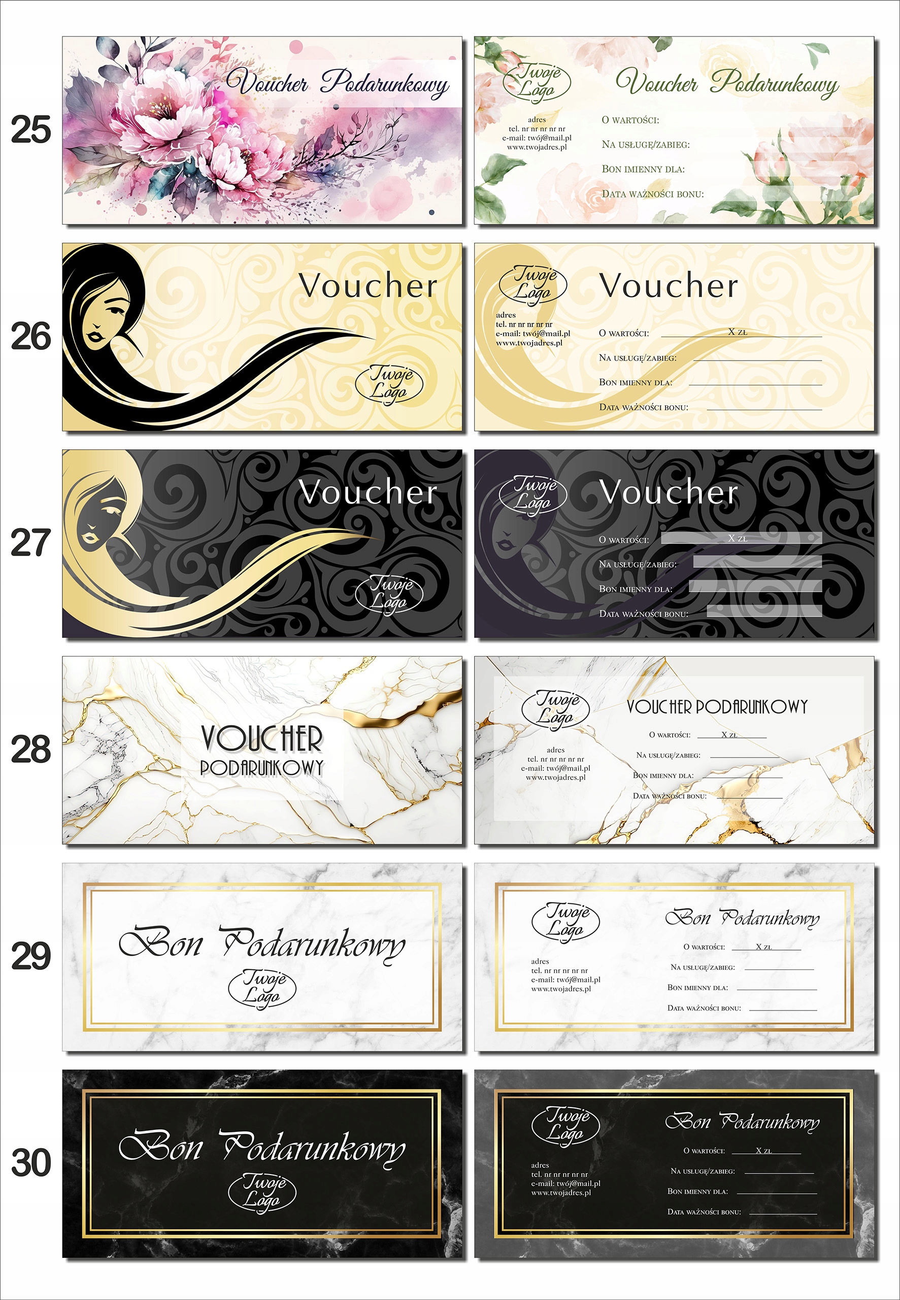 Наші подарункові ваучери надруковані на білому гладкому високоякісному папері щільністю 350 г, спеціально відібраному для друку реклами. Висока непрозорість, жорсткість і чудові властивості друку забезпечують відтворення графіки та тексту з неперевершеною точністю. Ми персоналізуємо ваучери, розміщуючи на них ваш логотип або назву, контактні дані, а також налаштовуємо поля для ручного написання відповідно до ваших інструкцій. У комплекті з відповідним конвертом DL наші ваучери є ідеальним поєднанням гнучкості, практичності й оригінальності, що робить їх надихаючим і цінним вибором.