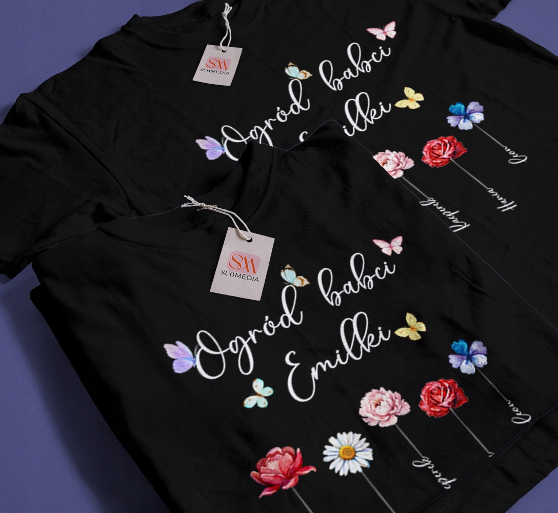 ПОДАРУНОК БАБУСІ ФУТБОЛКА БАБУСИН САД КРАСИВИЙ + ІМЕНА ДІТЕЙ КВІТИ
