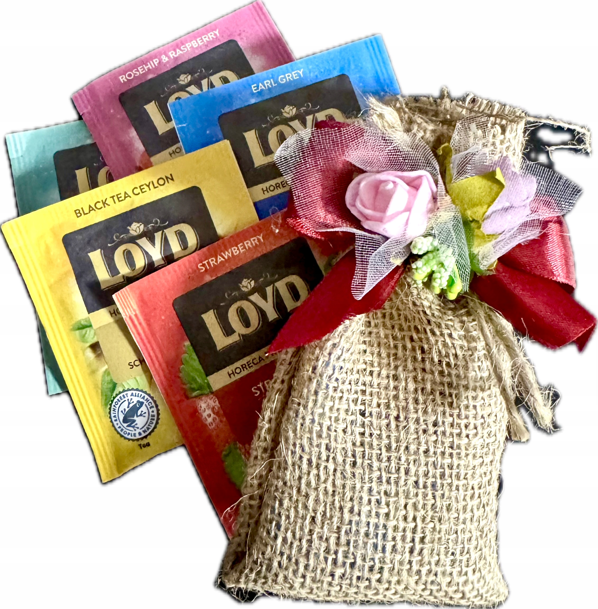 - 5 смачних чаїврізних смаків, упакованих в натуральний джут,