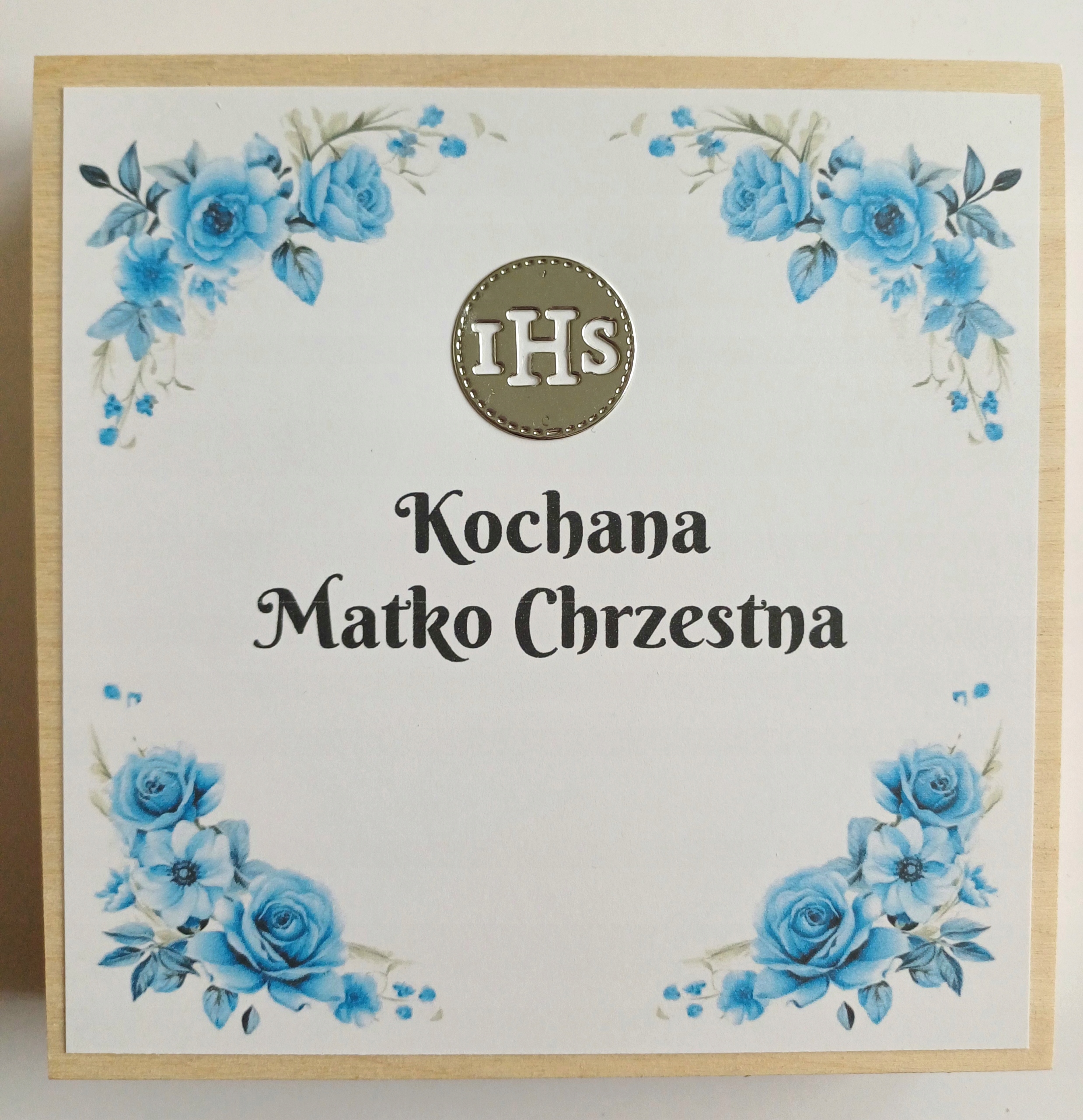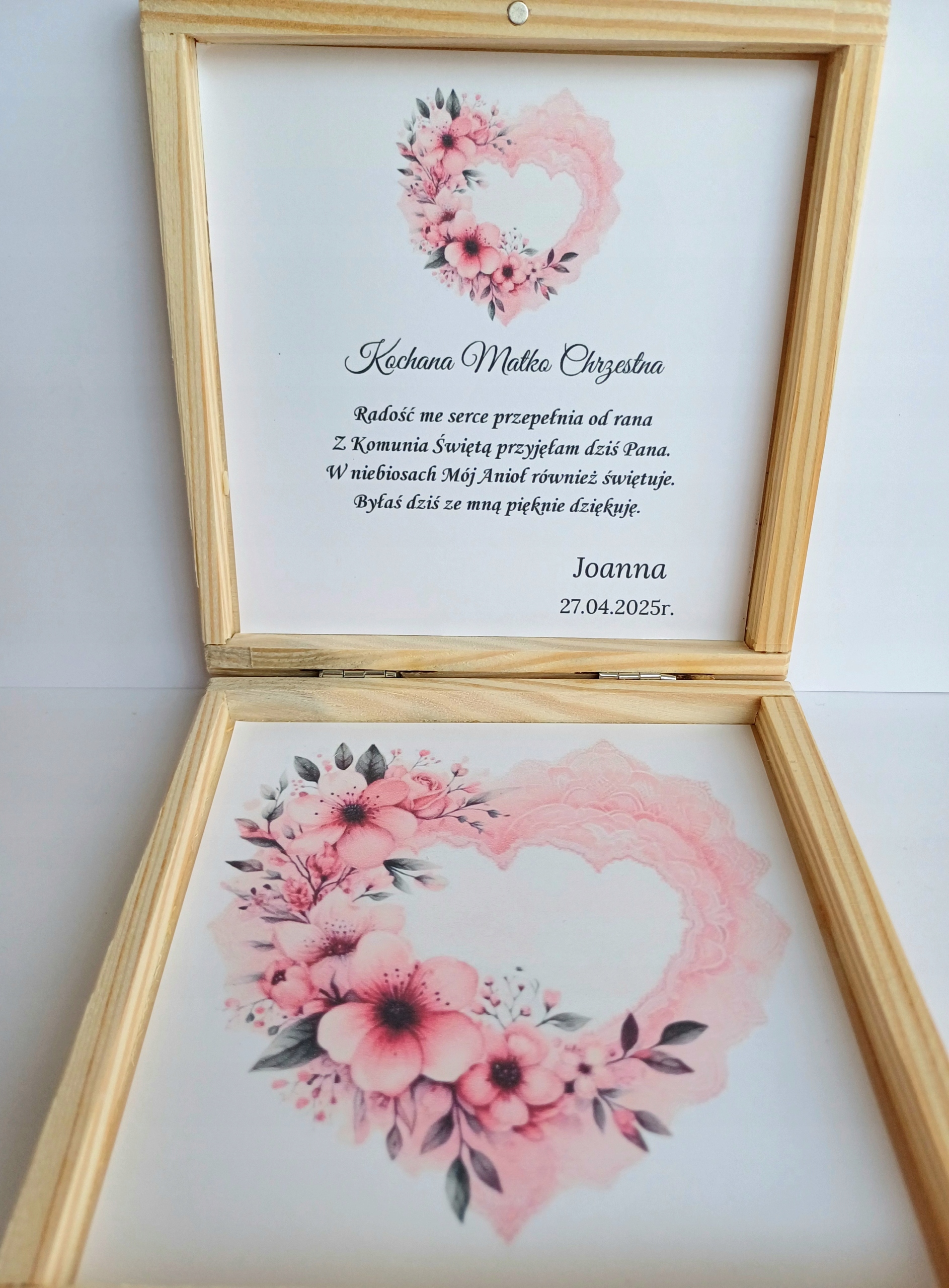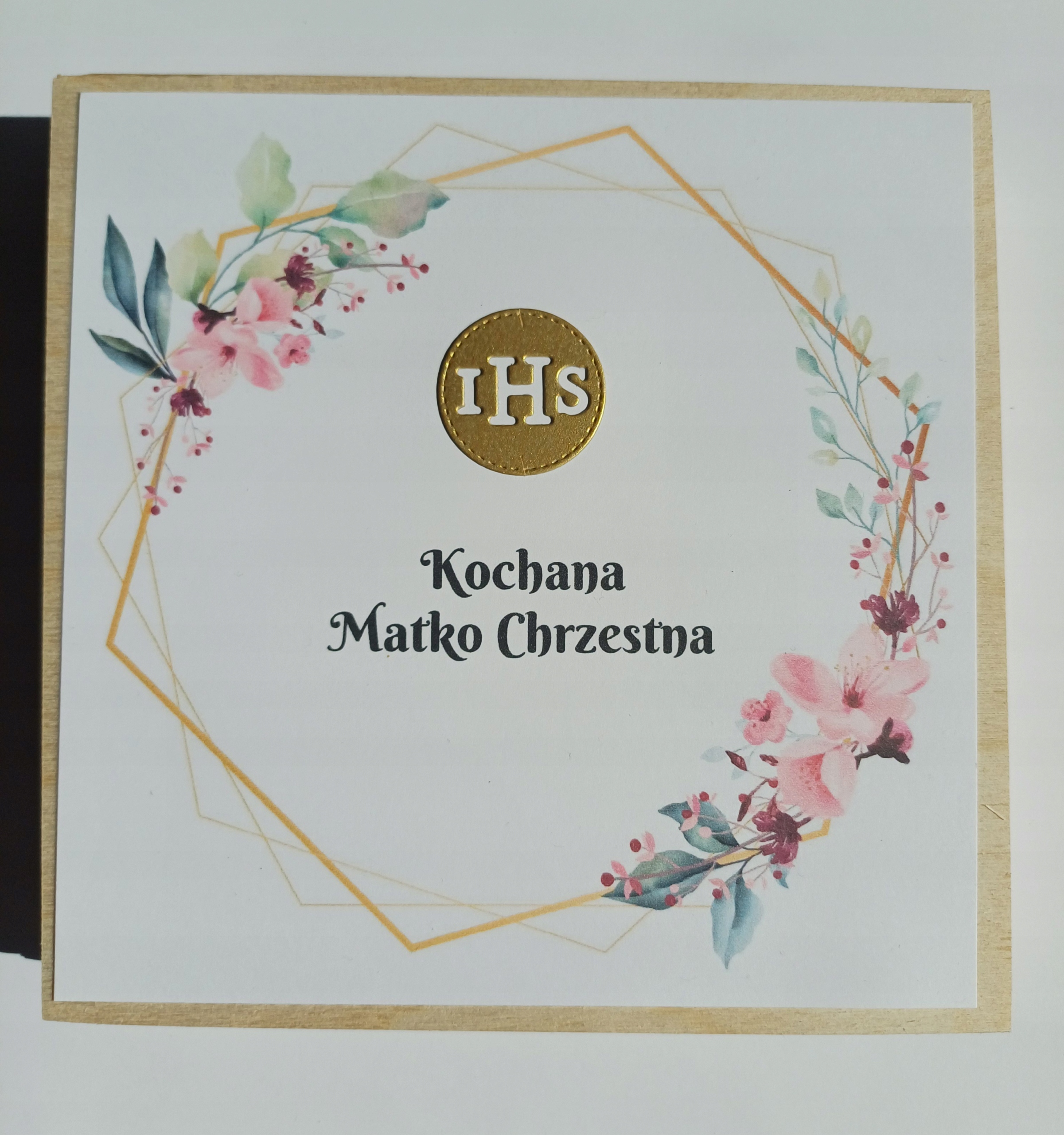 На верх коробки наклеєна декоративна картинка в обраному візерунку. Можливість розміщення власного тексту, напр. Для Дорогого хрещеного батька.