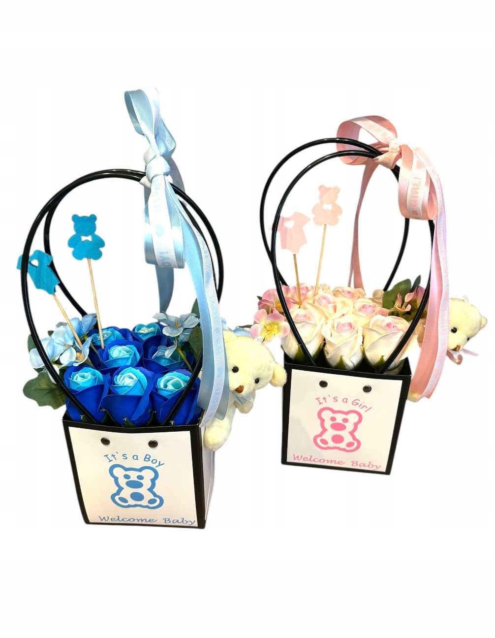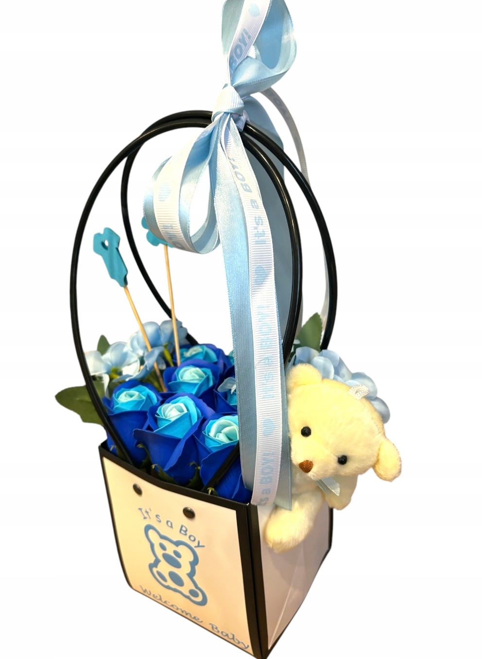 Квітка, виготовлена з мильних квітів у декоративному мішку з написами, доповненими штучними гортензіями з боків. Коробки. Кремовий, чарівний ведмідь "дивиться" збоку гаманця (у ведмедя синя стрічка під шиєю). Дві стрічки- сині та з написом "Це хлопчик".