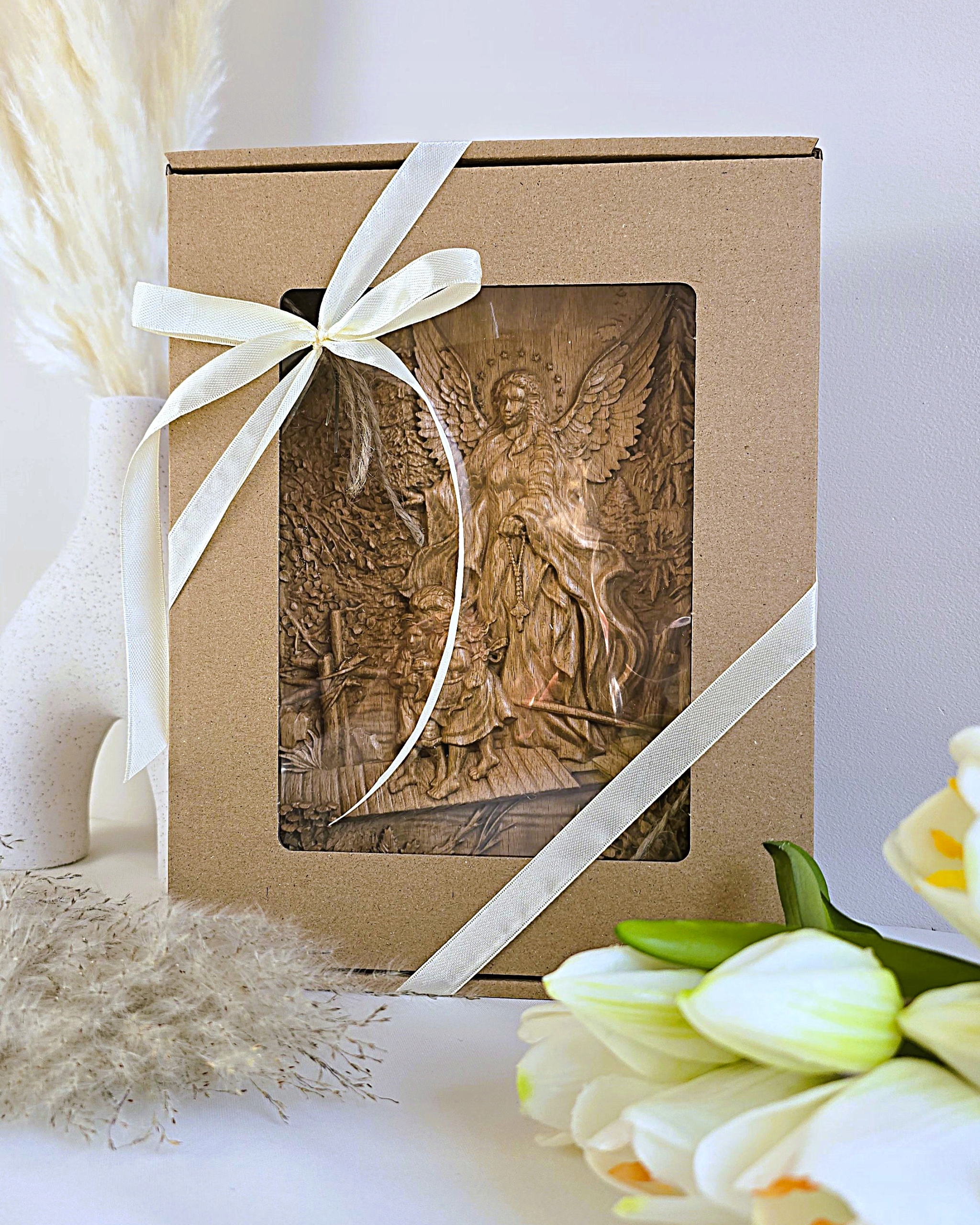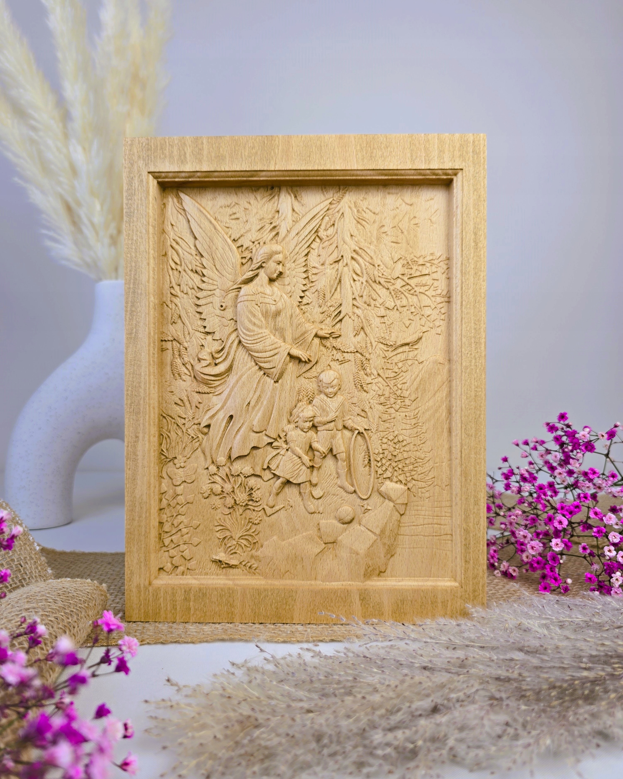 унікальний і унікальний бази -реліф з ангелом -охоронцем, виготовленим з твердої деревини - міцний, твердий і красиво неглибокий матеріал.
