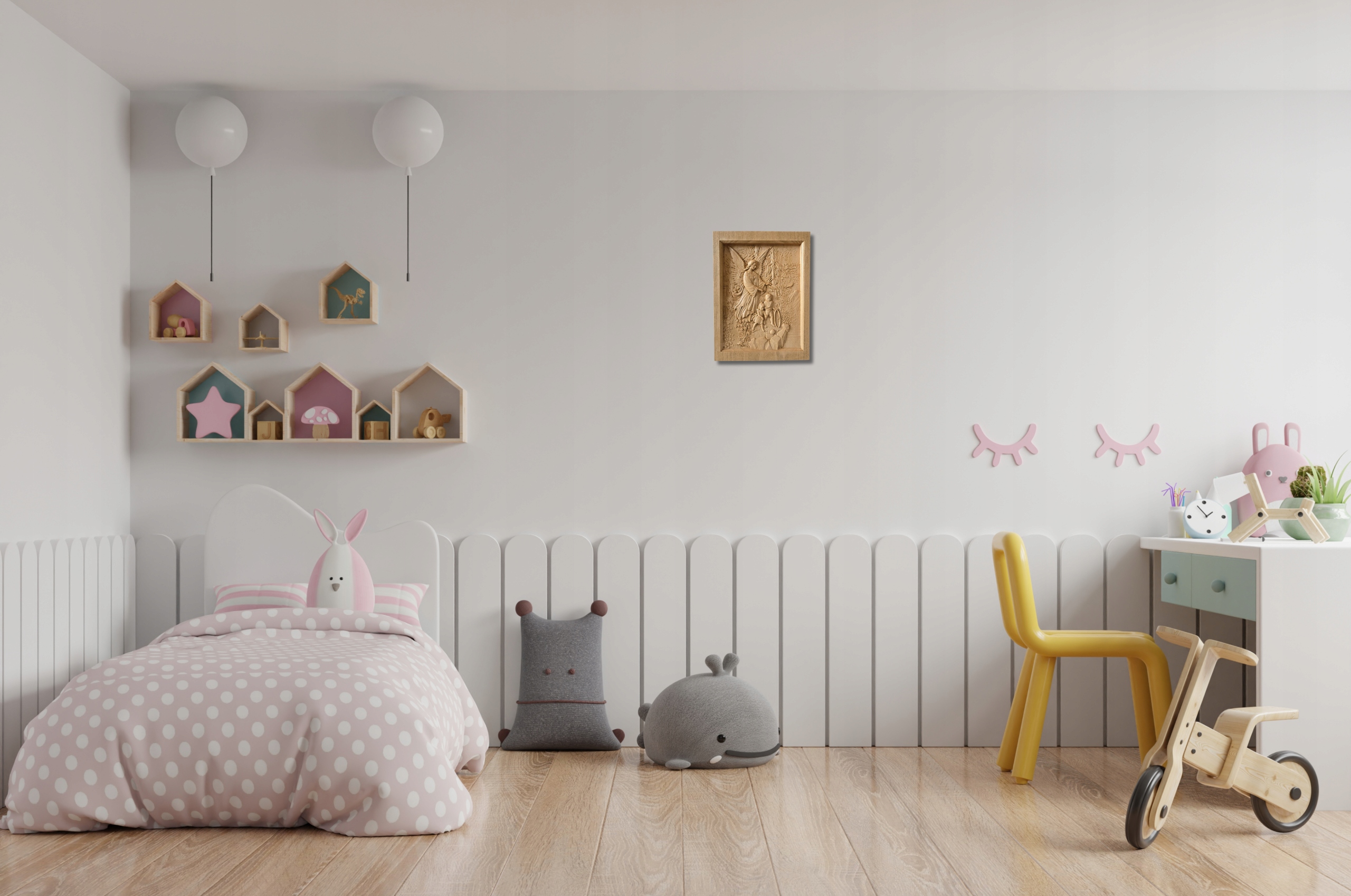Просторовий мотив представляє форму ангела -охоронця з дітьми, , що входить у класичний, позачасовий стиль прикрас для стін.
