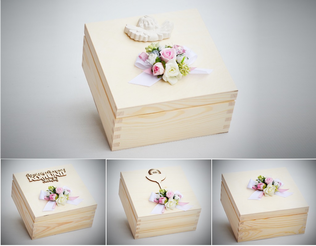 - елегантна оригінальна дерев'яна скарбничка з індивідуальним декором ручної роботи; розмір коробки 18x18x10 см