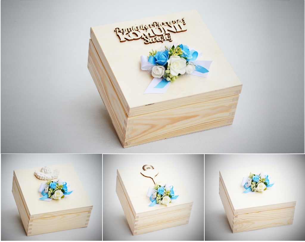 Оздоблення в ніжних блакитних тонах з біло-зеленими аксесуарами. У набір входить блакитний сувенір Першого Святого Причастя, який доповнює гарний зовнішній вигляд коробки, який можна використовувати як місце для Біблії, священної книги чи вервиці.
