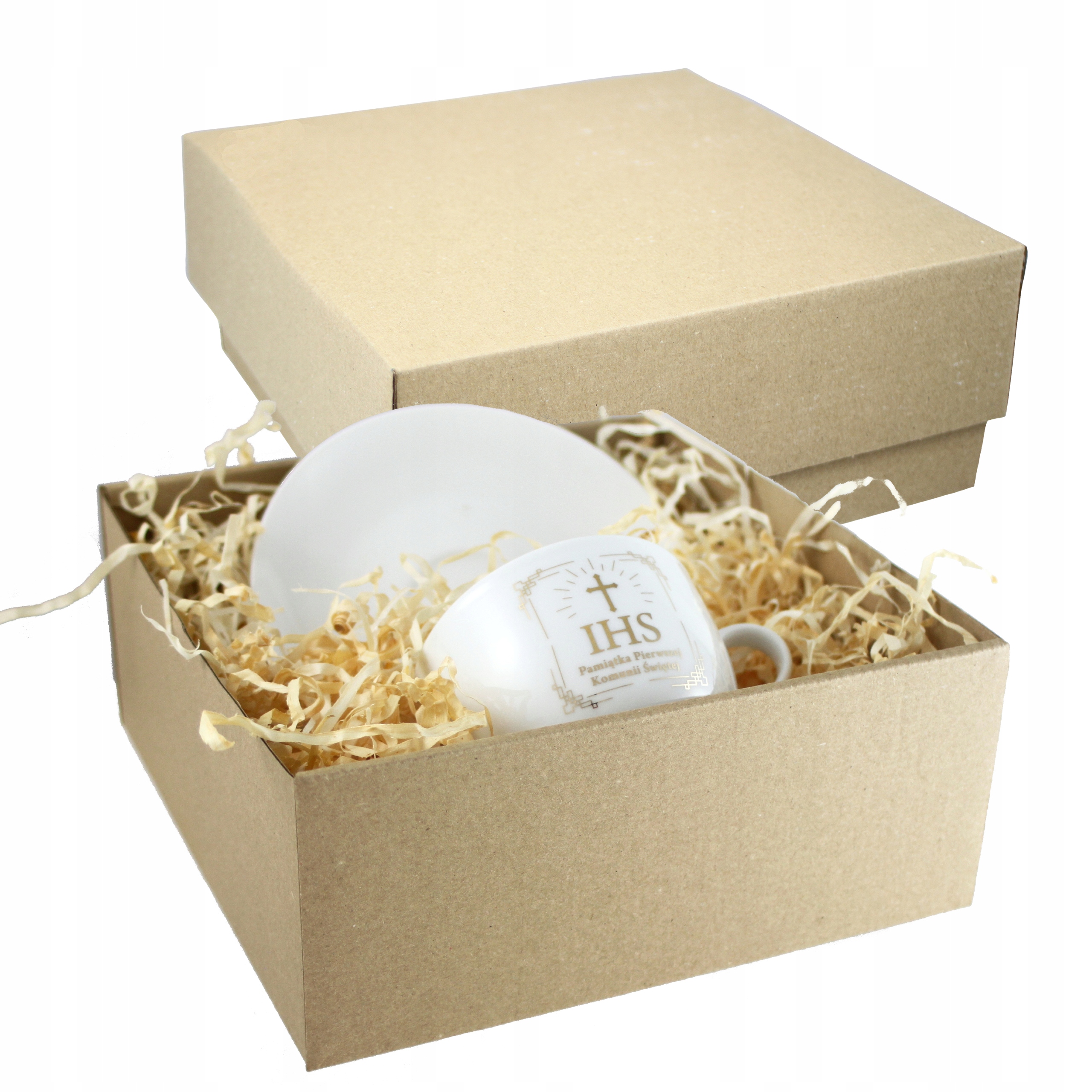 порцелянова чашка в благородному теплому тіні білого кольору з посвятою золотистого причастя. Сувенір першого Святого Причастя