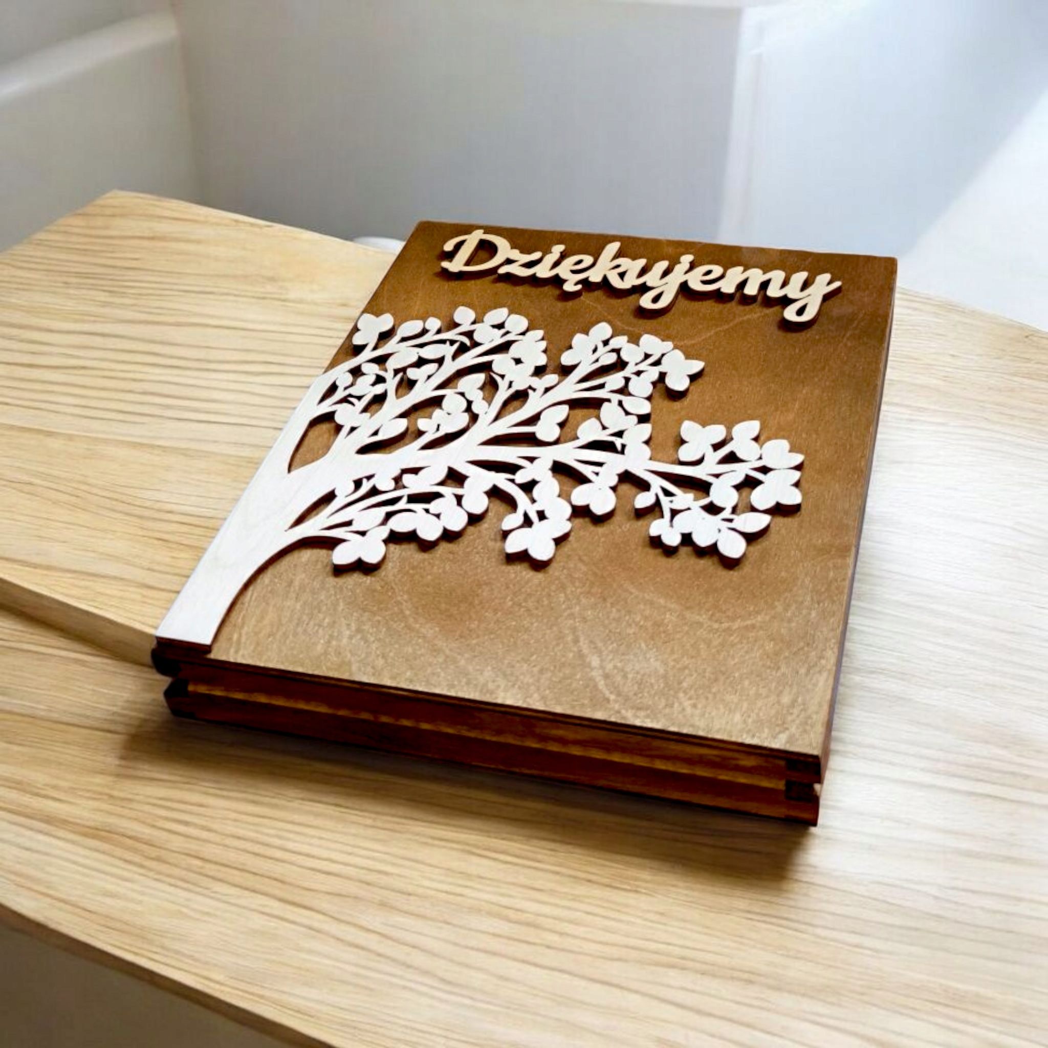 елегантний, закритий, закритий коробка у світлого кольору дуба, виготовлений з дерева, з лазерним написом "дякую" та декоративним мотивом дерева за кришкою дерева.