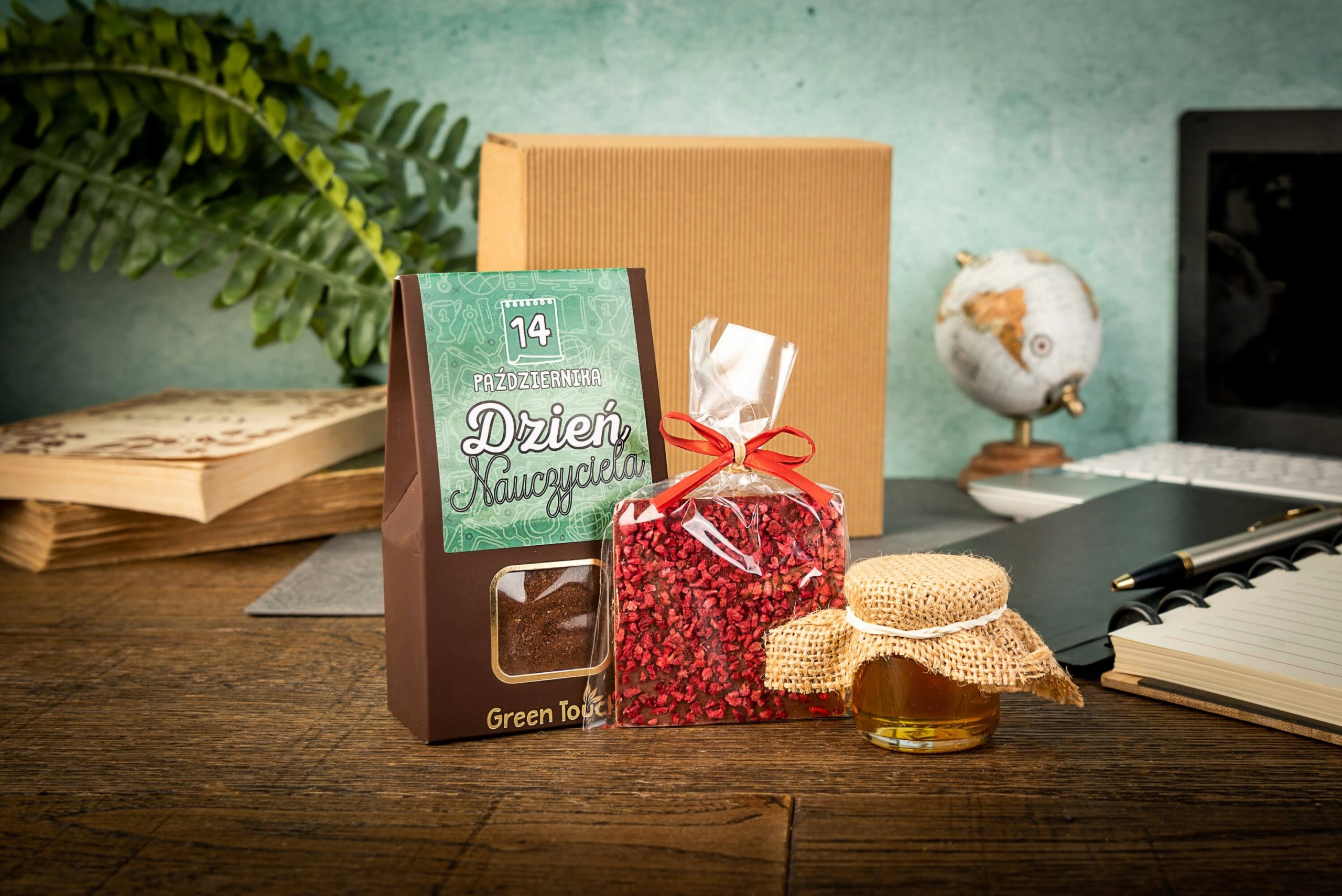 Подарунковий набір - гарний спосіб подяки вчителю. Всередині свіжозмелена ароматна кава 100% Arabica Brazil Yellow Bourbon, упакована в елегантну коричневу коробку. Його доповнюють мультиквітковий мед і шоколад ручної роботи з ліофілізованими фруктами. Все це упаковано в декоративну коробку, наповнену крафт-папером преміум-класу.